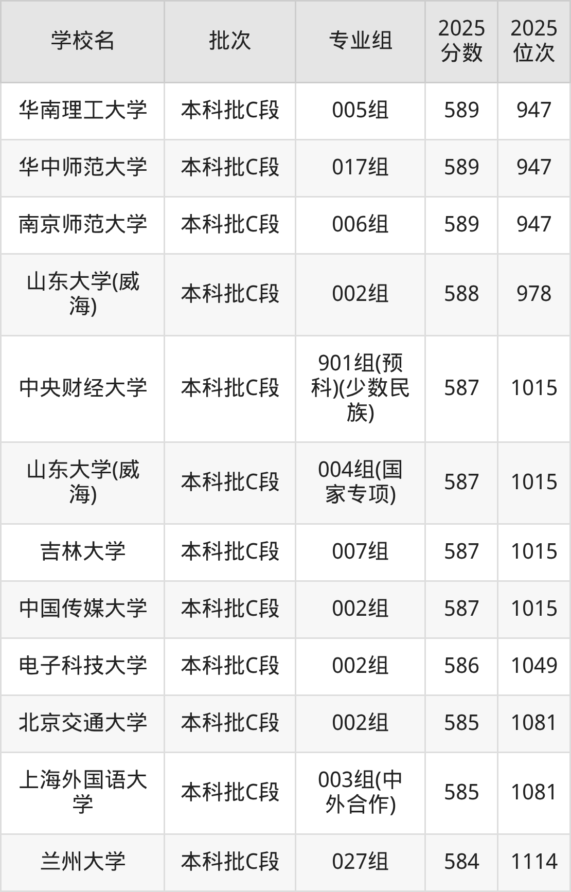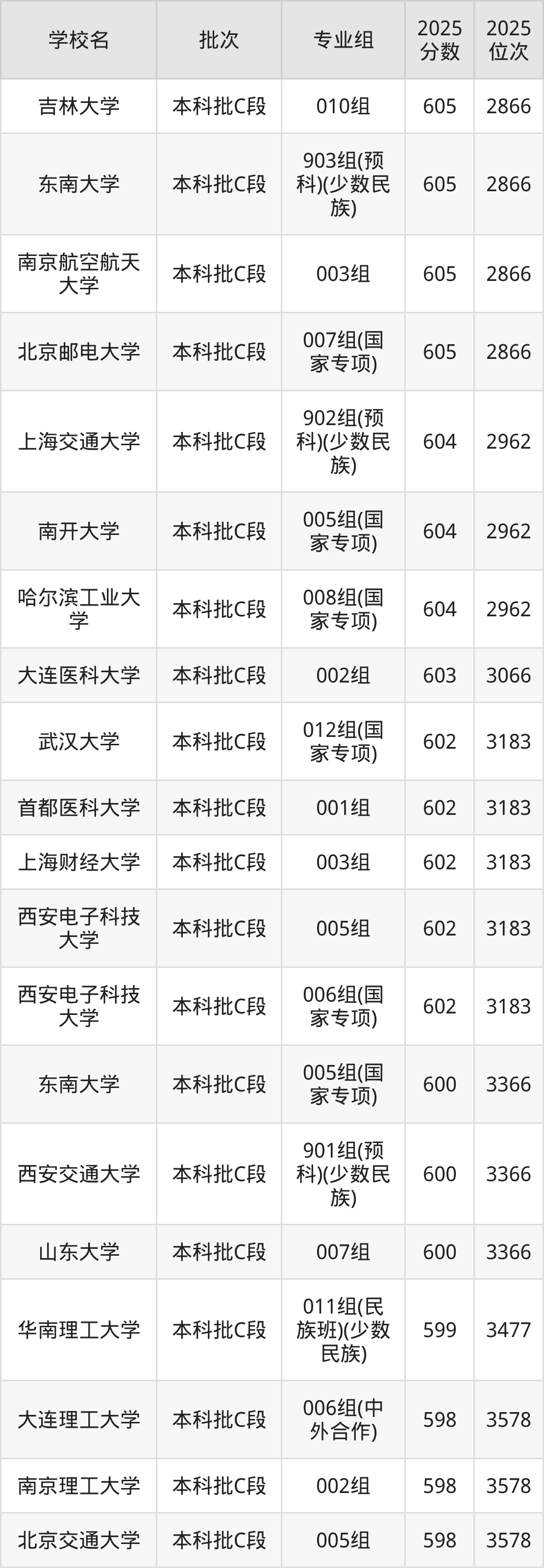 2025年甘肃高考物理类600分(3267名~3366名)能上的大学有东南大学005组(国家专项)、山东大学007组、西安交通大学901组(预科)(少数民族)。
