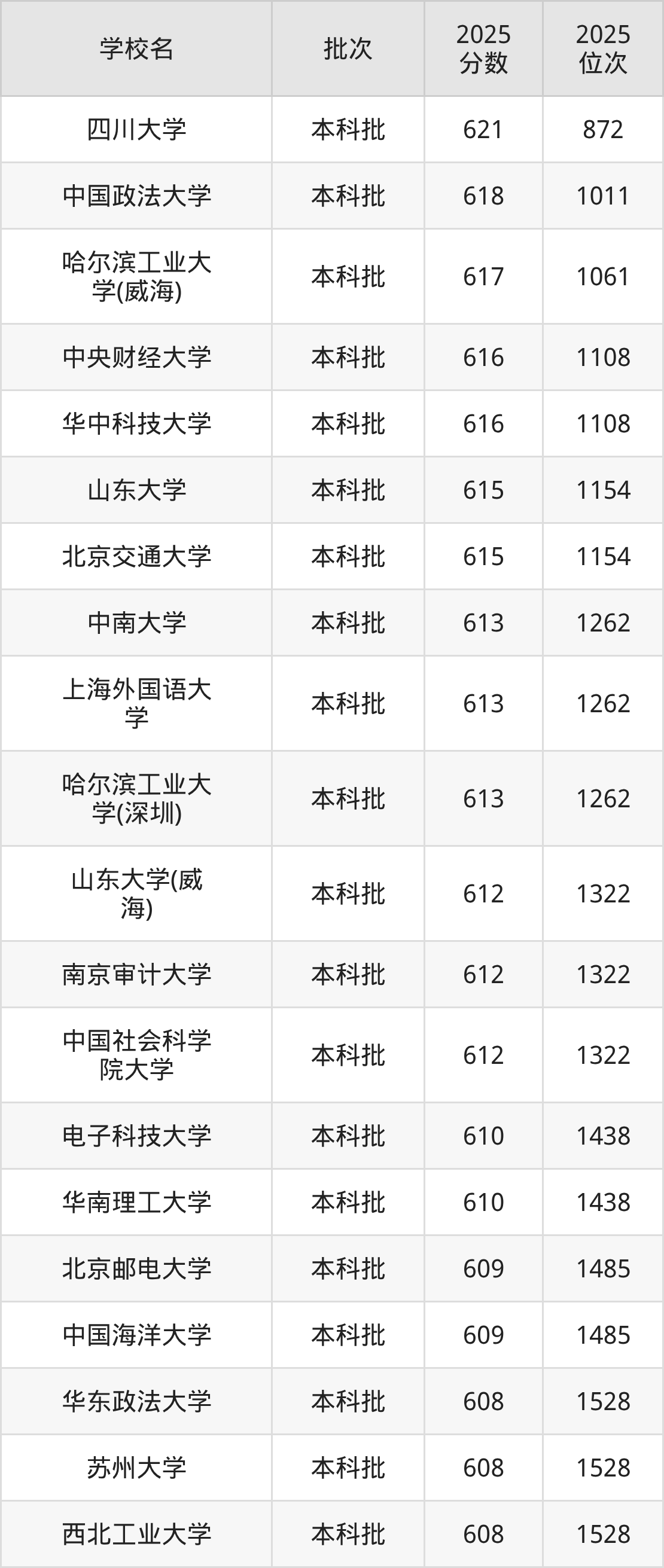 2025年辽宁高考历史类610分(1369名~1438名)能上的大学有电子科技大学、华南理工大学。