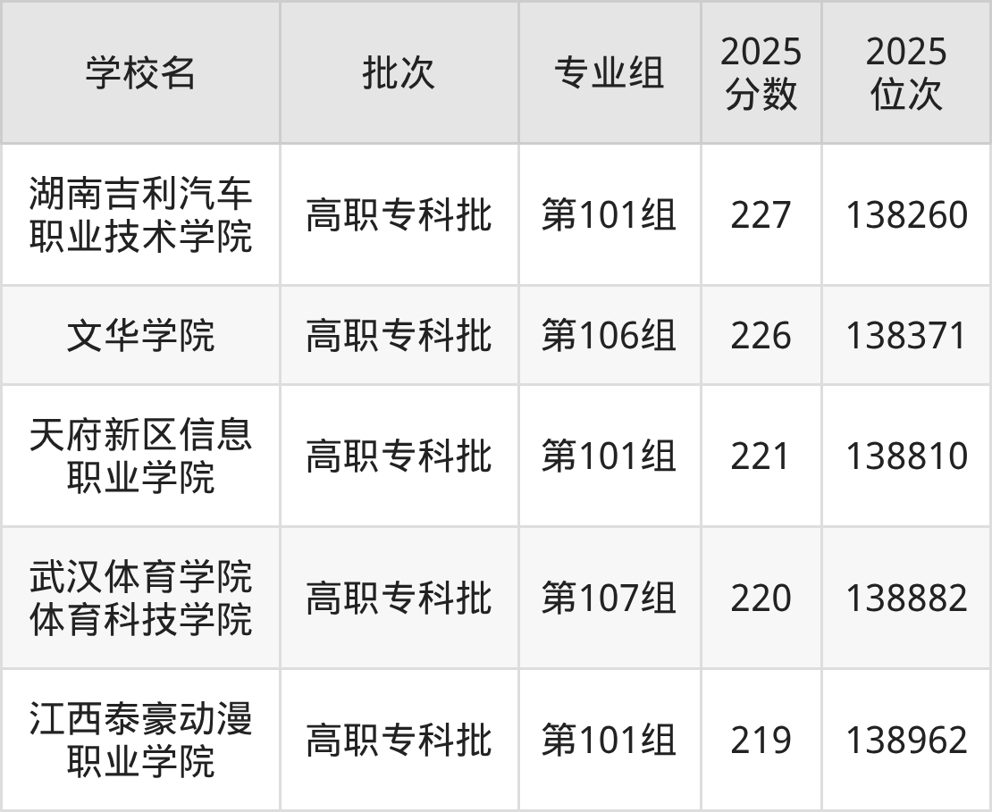 2025年湖南高考历史类222分(138631名~138732名)录取位次低于该区间(较稳妥)的有天府新区信息职业学院第101组(138810名)、武汉体育学院体育科技学院第107组(138882名)等;录取位次高于该区间(可冲)的有文华学院第106组(138371名)、湖南吉利汽车职业技术学院第101组(138260名)等。