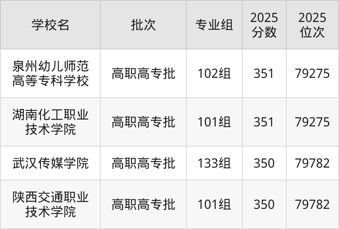 2025年广西高考历史类350分(79276名~79782名)能上的大学有陕西交通职业技术学院101组、武汉传媒学院133组。