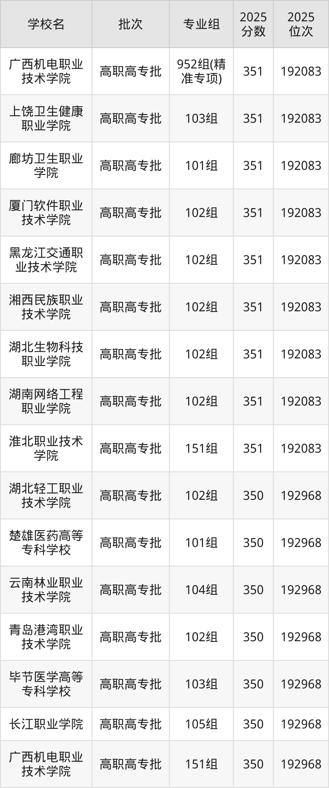 另外录取位次低于该区间(较稳妥)的有赣州职业技术学院101组(193941名)、湖南现代物流职业技术学院102组(193941名)等;录取位次高于该区间(可冲)的有广西机电职业技术学院952组(精准专项)(192083名)、淮北职业技术学院151组(192083名)等。