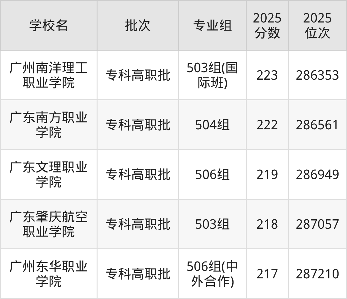 2025年广东高考历史类220分(286745名~286860名)录取位次低于该区间(较稳妥)的有广东文理职业学院506组(286949名)、广东肇庆航空职业学院503组(287057名)等;录取位次高于该区间(可冲)的有广东南方职业学院504组(286561名)、广州南洋理工职业学院503组(国际班)(286353名)等。