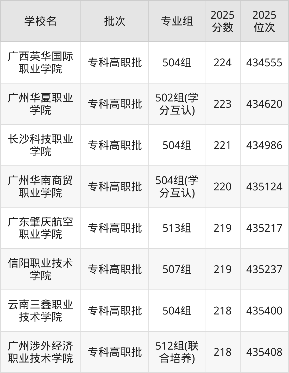 另外录取位次低于该区间(较稳妥)的有广东肇庆航空职业学院513组(435217名)、信阳职业技术学院507组(435237名)等;录取位次高于该区间(可冲)的有长沙科技职业学院504组(434986名)、广州华夏职业学院502组(学分互认)(434620名)等。