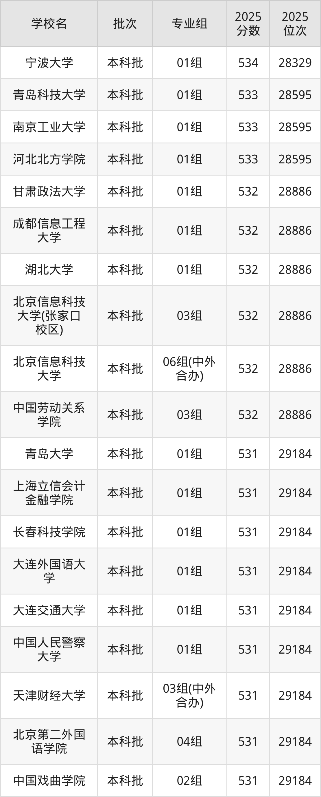 2025年北京高考532分(28596名~28886名)能上的大学有中国劳动关系学院03组、北京信息科技大学06组(中外合办)、北京信息科技大学(张家口校区)03组、湖北大学01组等。
