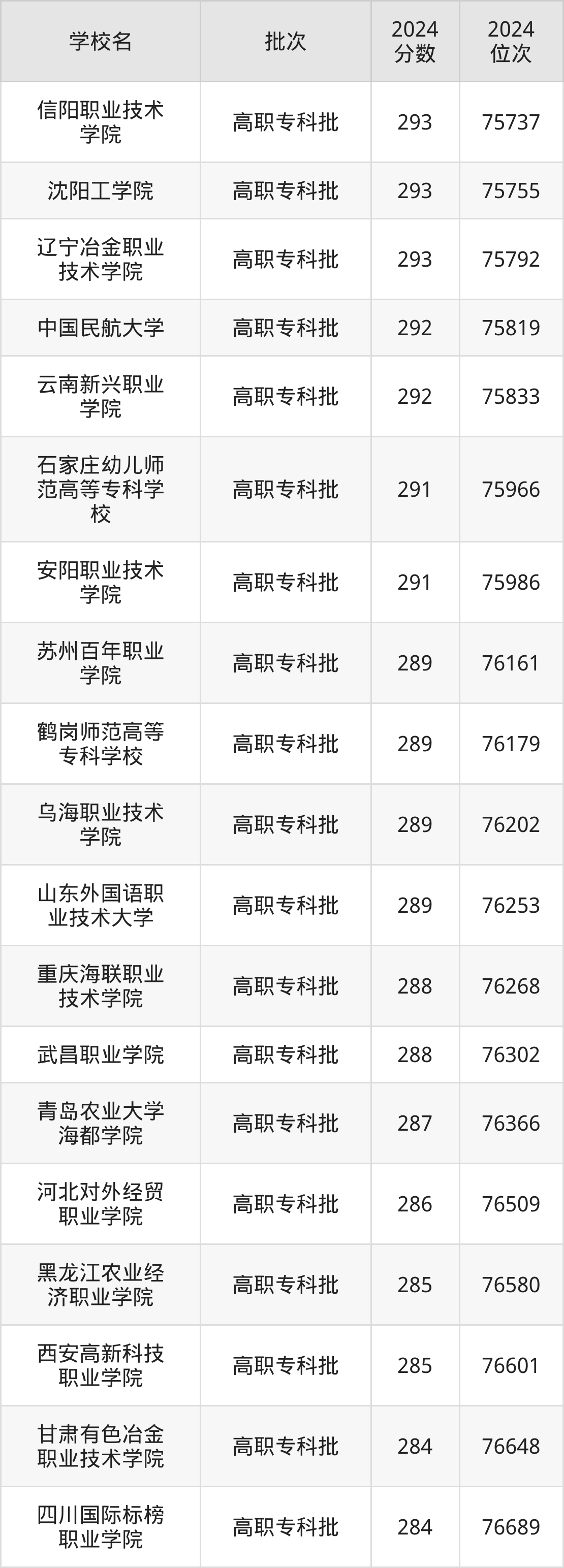 2024年陕西高考文科289分(76138名~76257名)能上的大学有乌海职业技术学院、鹤岗师范高等专科学校、苏州百年职业学院、山东外国语职业技术大学。