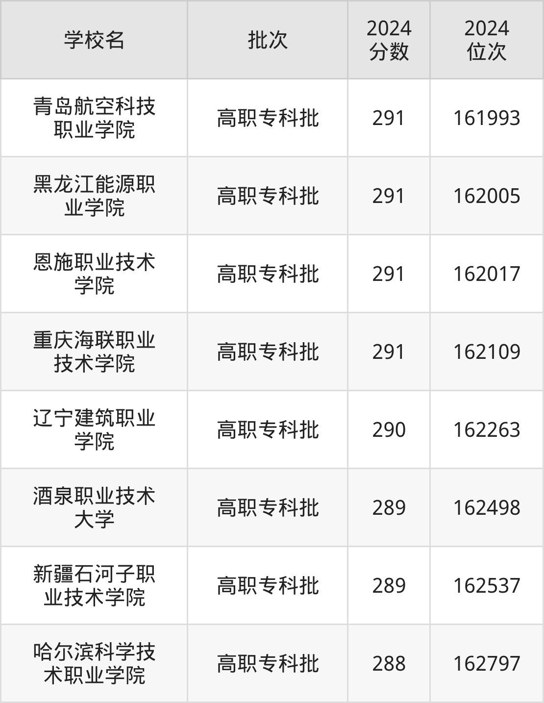 另外录取位次低于该区间(较稳妥)的有哈尔滨科学技术职业学院(162797名)、常州纺织服装职业技术学院(163337名)等;录取位次高于该区间(可冲)的有辽宁建筑职业学院(162263名)、重庆海联职业技术学院(162109名)等。