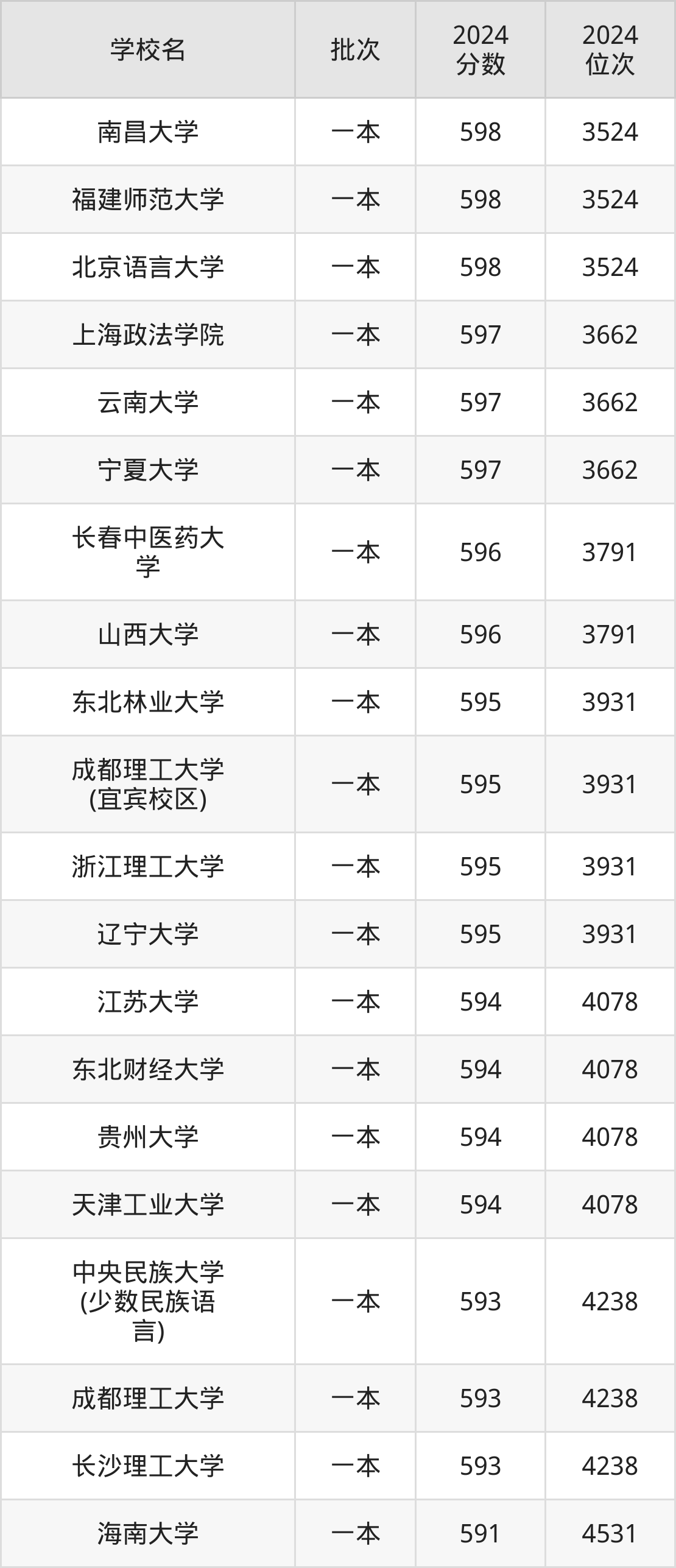 2024年云南高考文科594分(3932名~4078名)能上的大学有贵州大学、天津工业大学、东北财经大学、江苏大学。