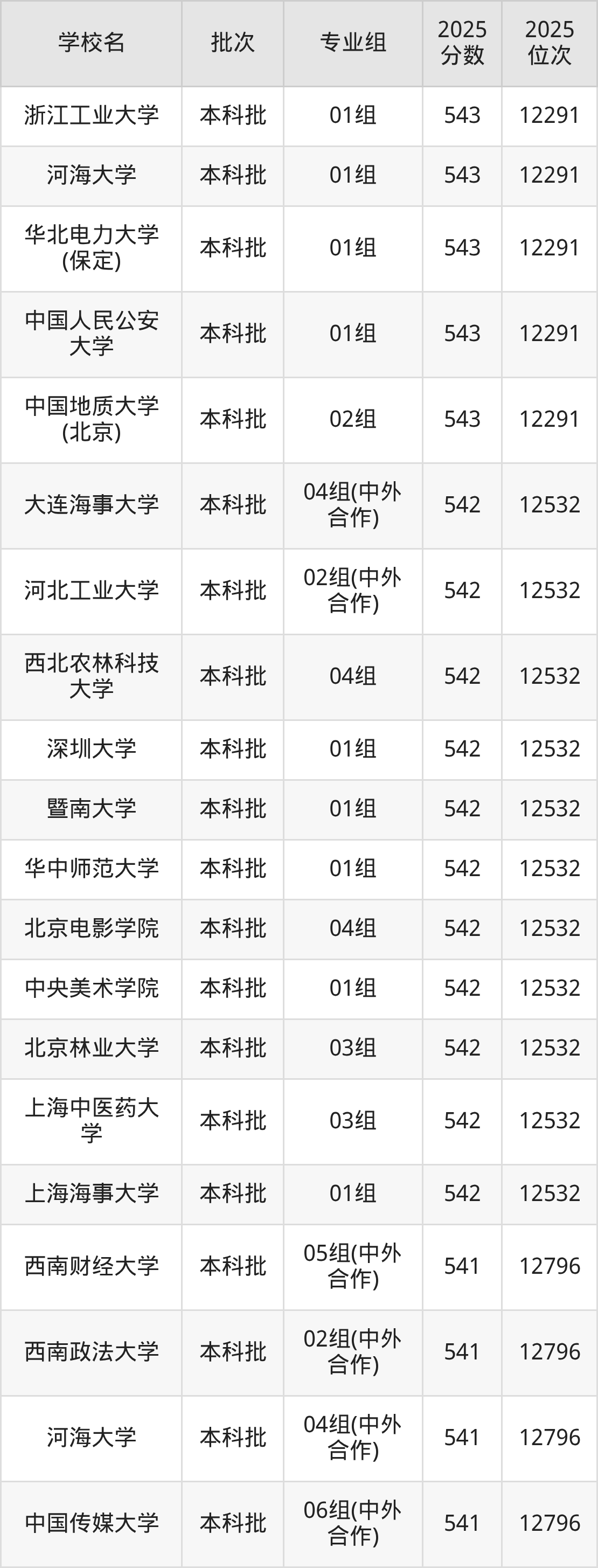 2025年上海高考542分(12292名~12532名)能上的大学有上海海事大学01组、上海中医药大学03组、北京林业大学03组、中央美术学院01组等。