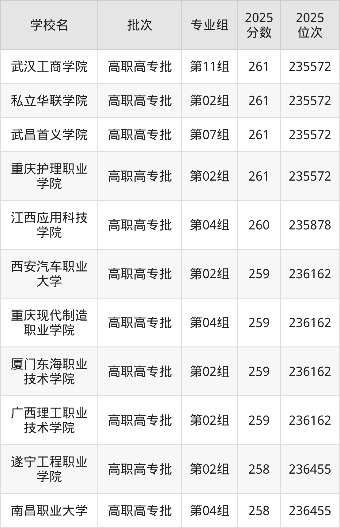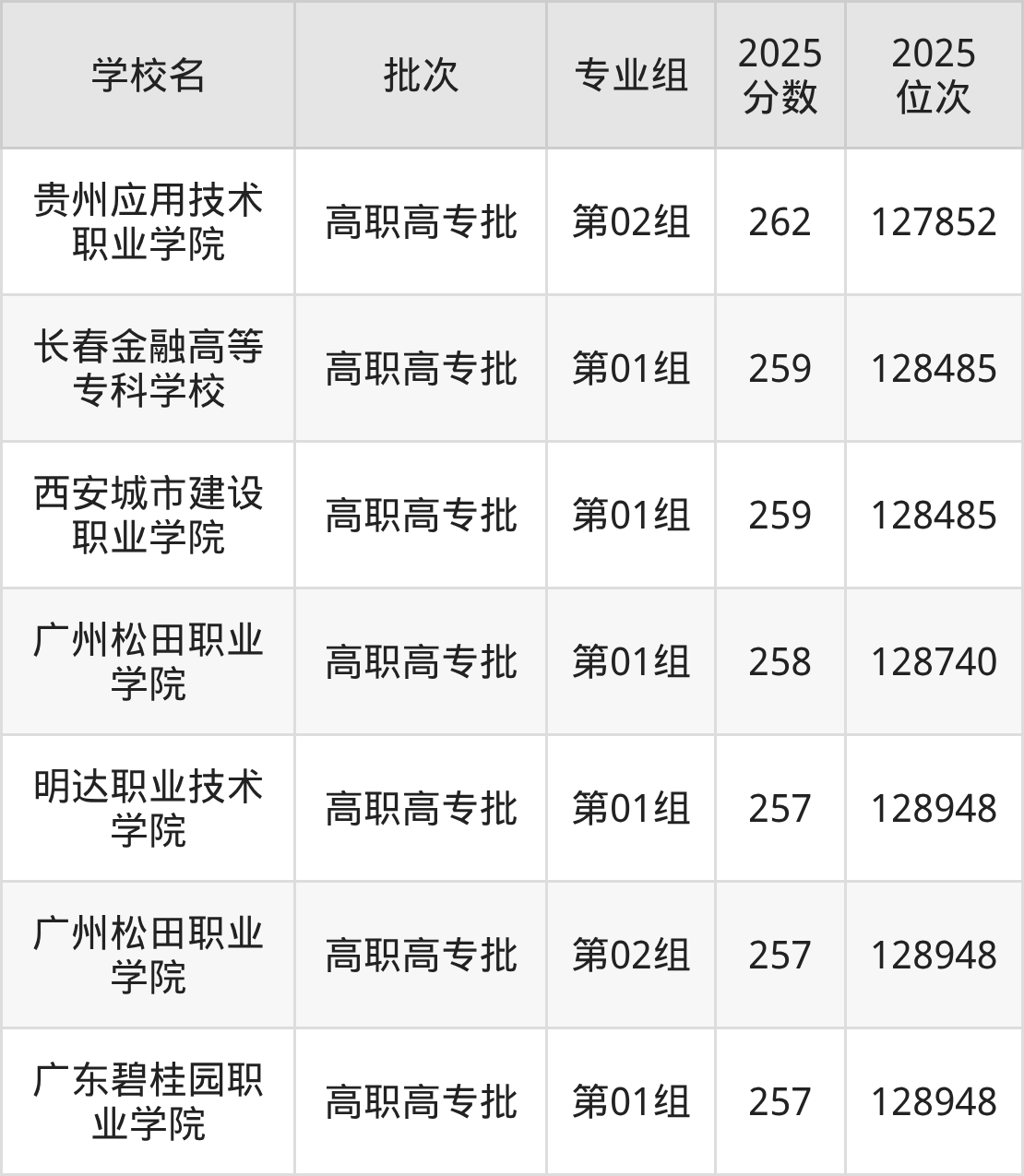 2025年湖北高考历史类259分(128287名~128485名)能上的大学有长春金融高等专科学校第01组、西安城市建设职业学院第01组。
