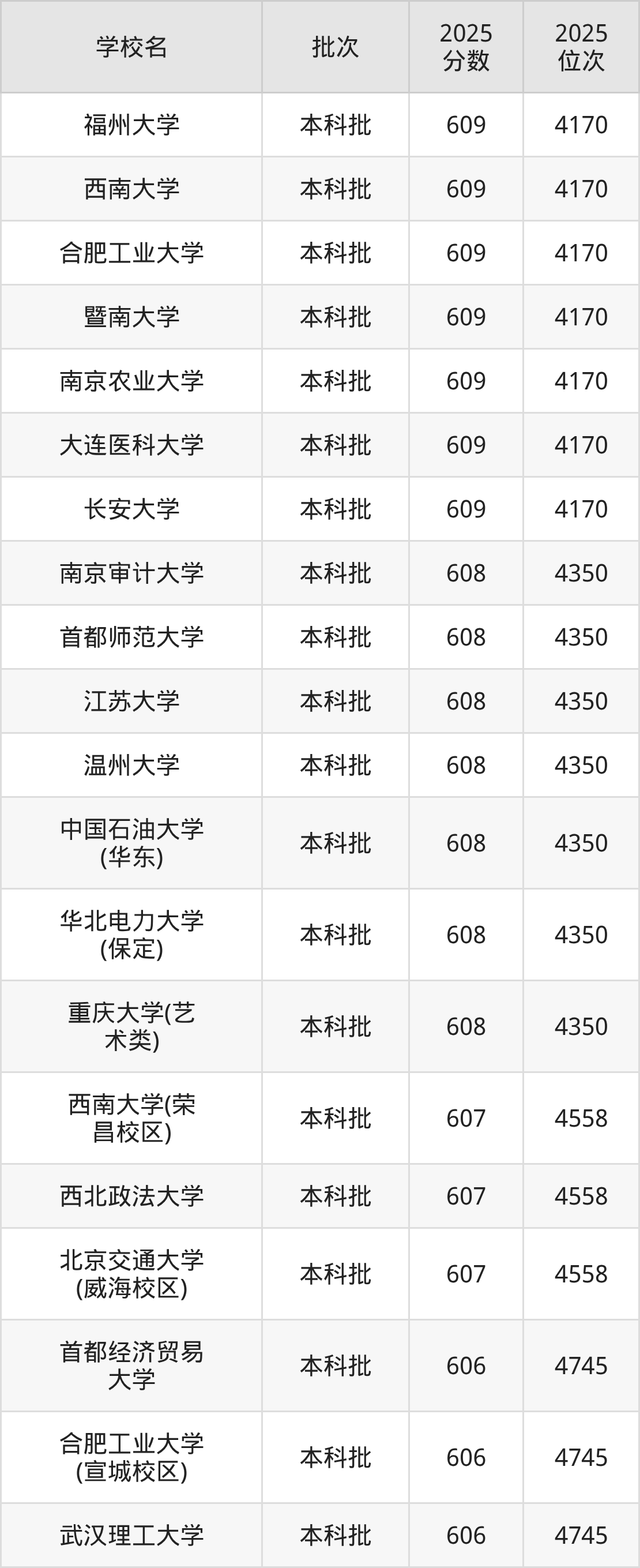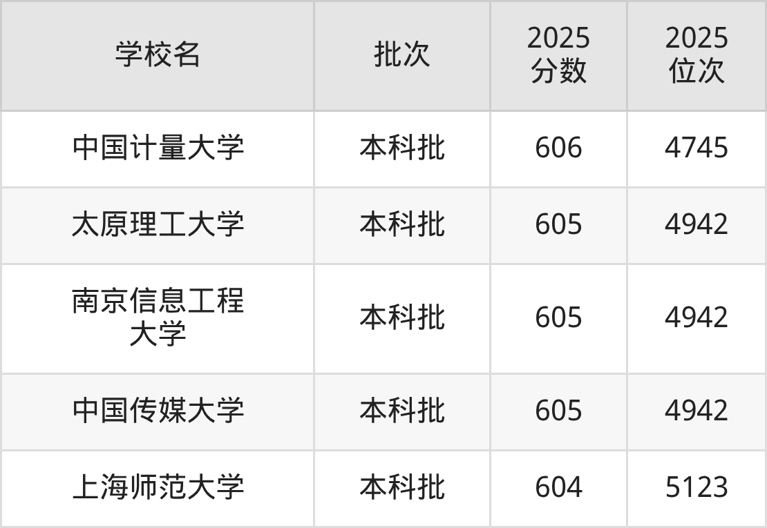 2025年河北高考历史类606分(4559名~4745名)能上的大学有合肥工业大学(宣城校区)、首都经济贸易大学、武汉理工大学、中国计量大学。
