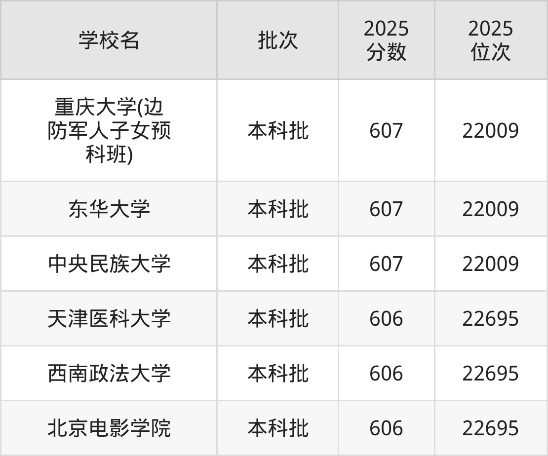 2025年河北高考物理类606分(22010名~22695名)能上的大学有天津医科大学、北京电影学院、西南政法大学。