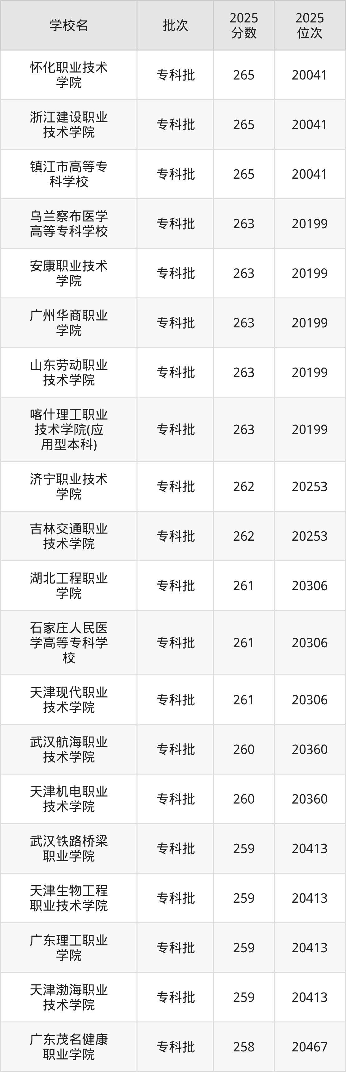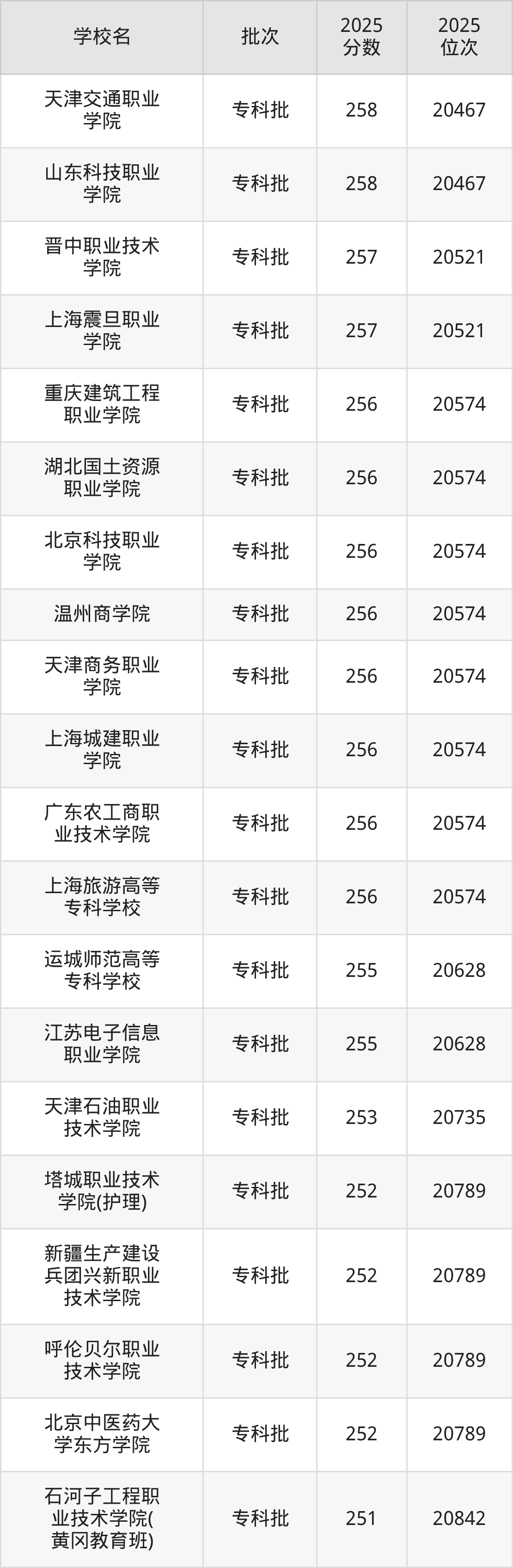2025年新疆高考文科256分(20522名~20574名)能上的大学有上海旅游高等专科学校、广东农工商职业技术学院、上海城建职业学院、天津商务职业学院等。