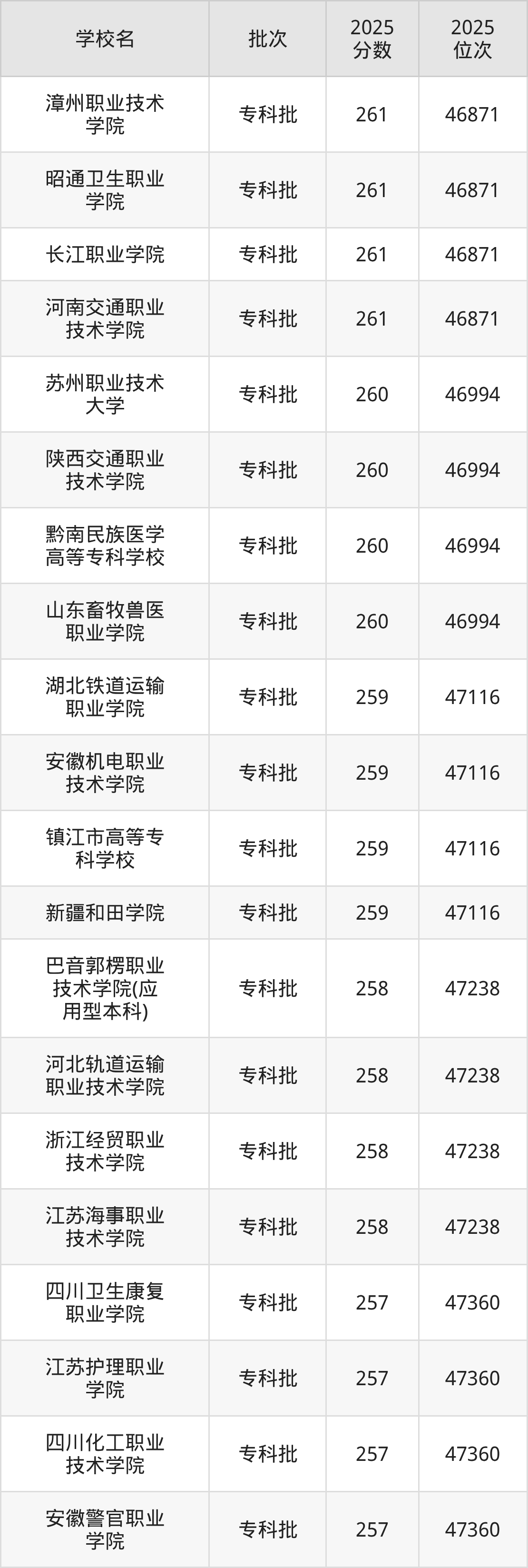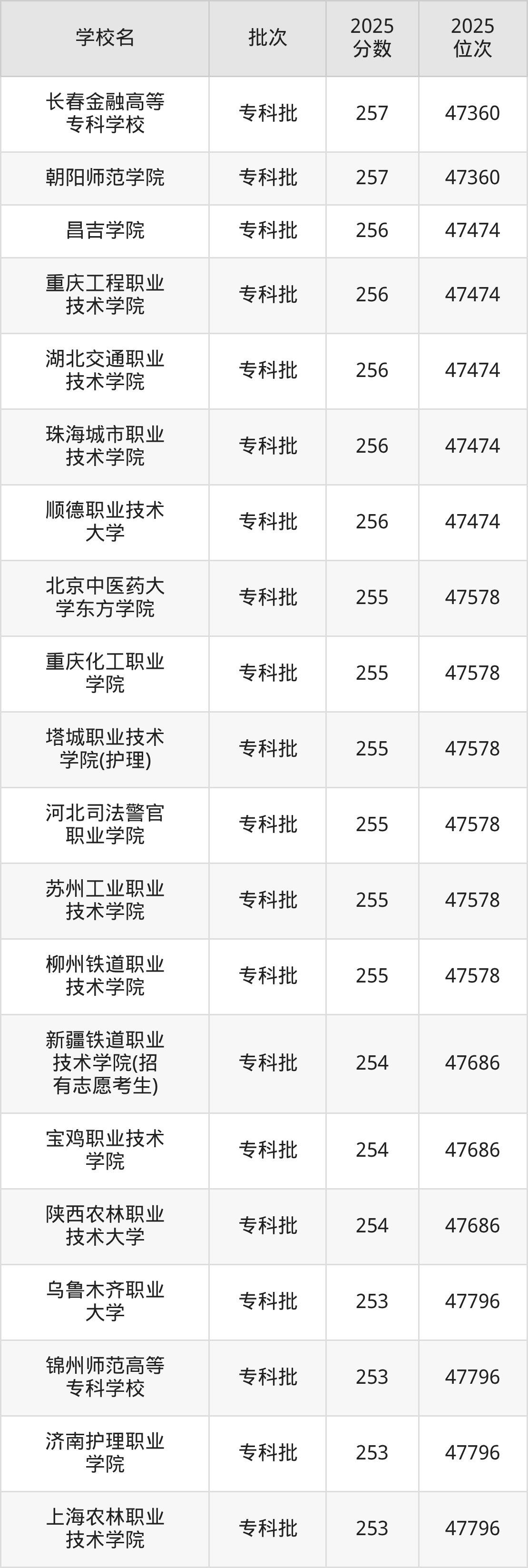2025年新疆高考理科256分(47361名~47474名)能上的大学有顺德职业技术大学、昌吉学院、湖北交通职业技术学院、重庆工程职业技术学院等。