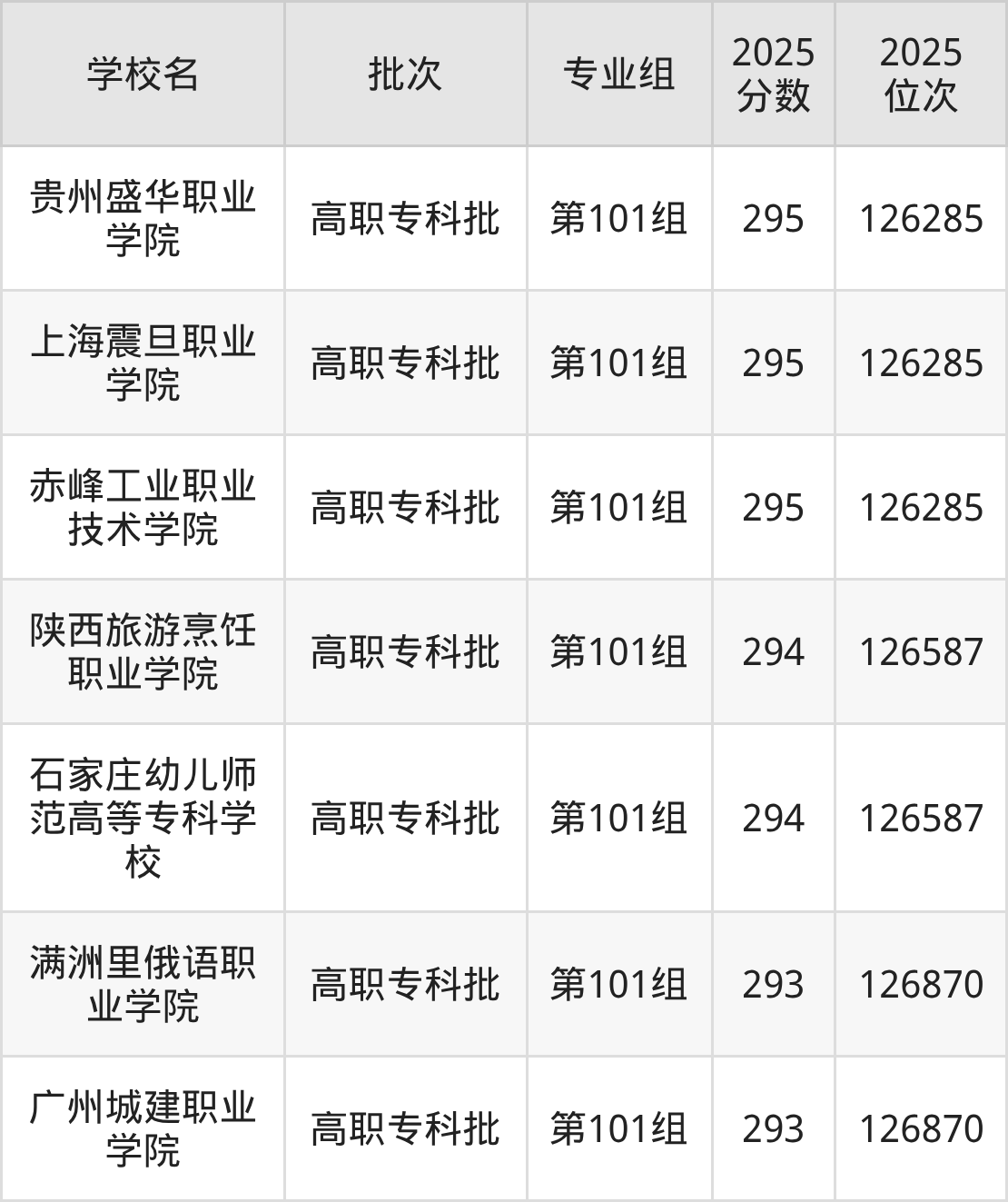 另外录取位次低于该区间(较稳妥)的有广州城建职业学院第101组(126870名)、满洲里俄语职业学院第101组(126870名)等;录取位次高于该区间(可冲)的有上海震旦职业学院第101组(126285名)、贵州盛华职业学院第101组(126285名)等。
