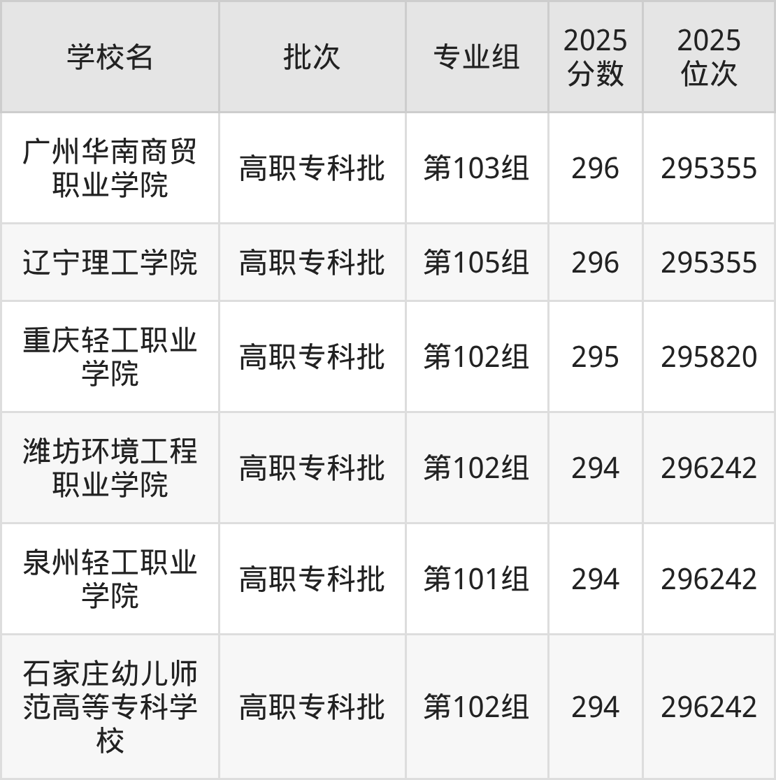 2025年湖南高考物理类294分(295821名~296242名)能上的大学有石家庄幼儿师范高等专科学校第102组、泉州轻工职业学院第101组、潍坊环境工程职业学院第102组。