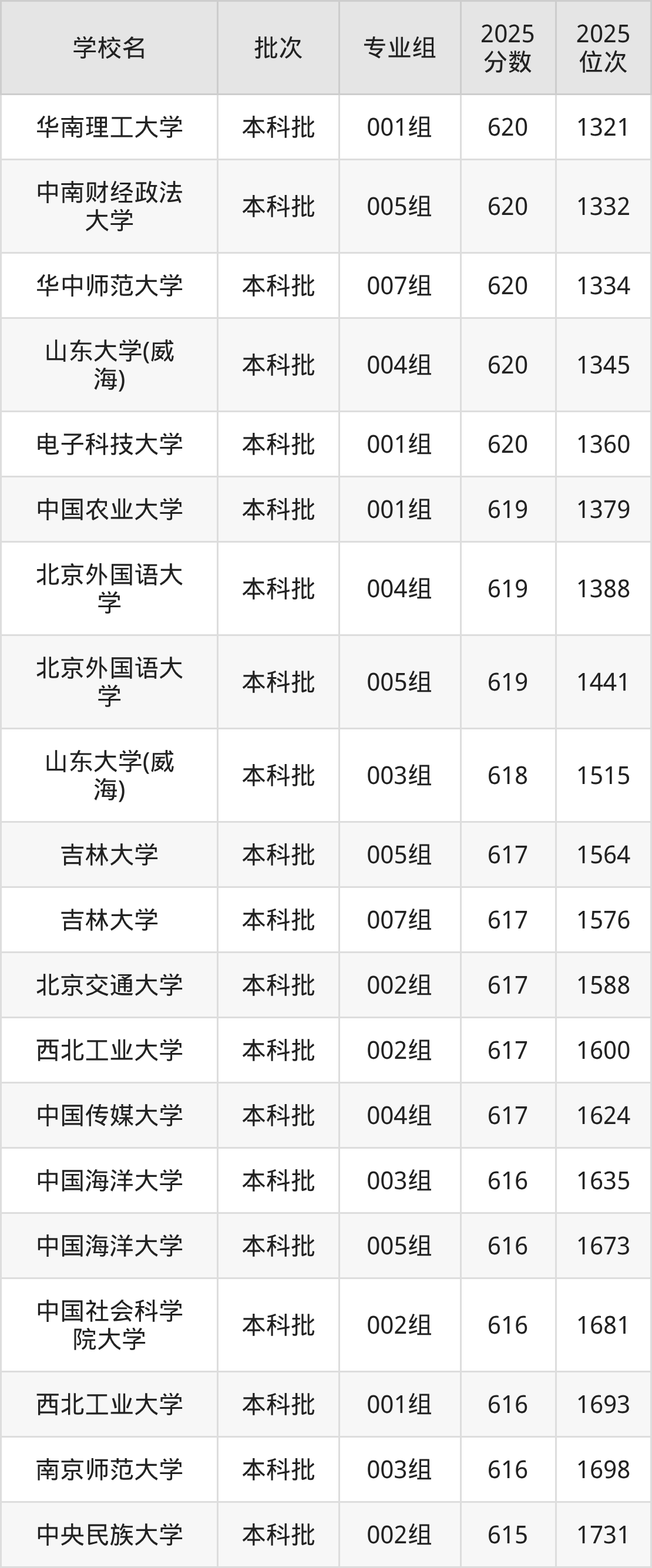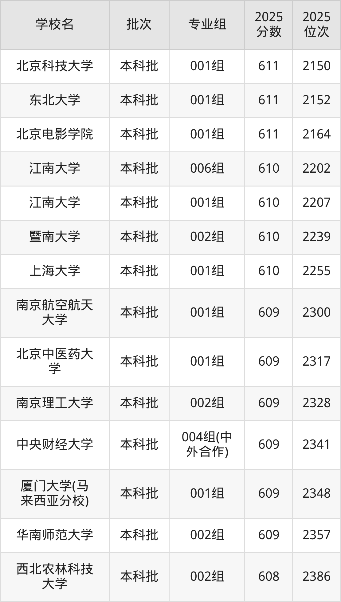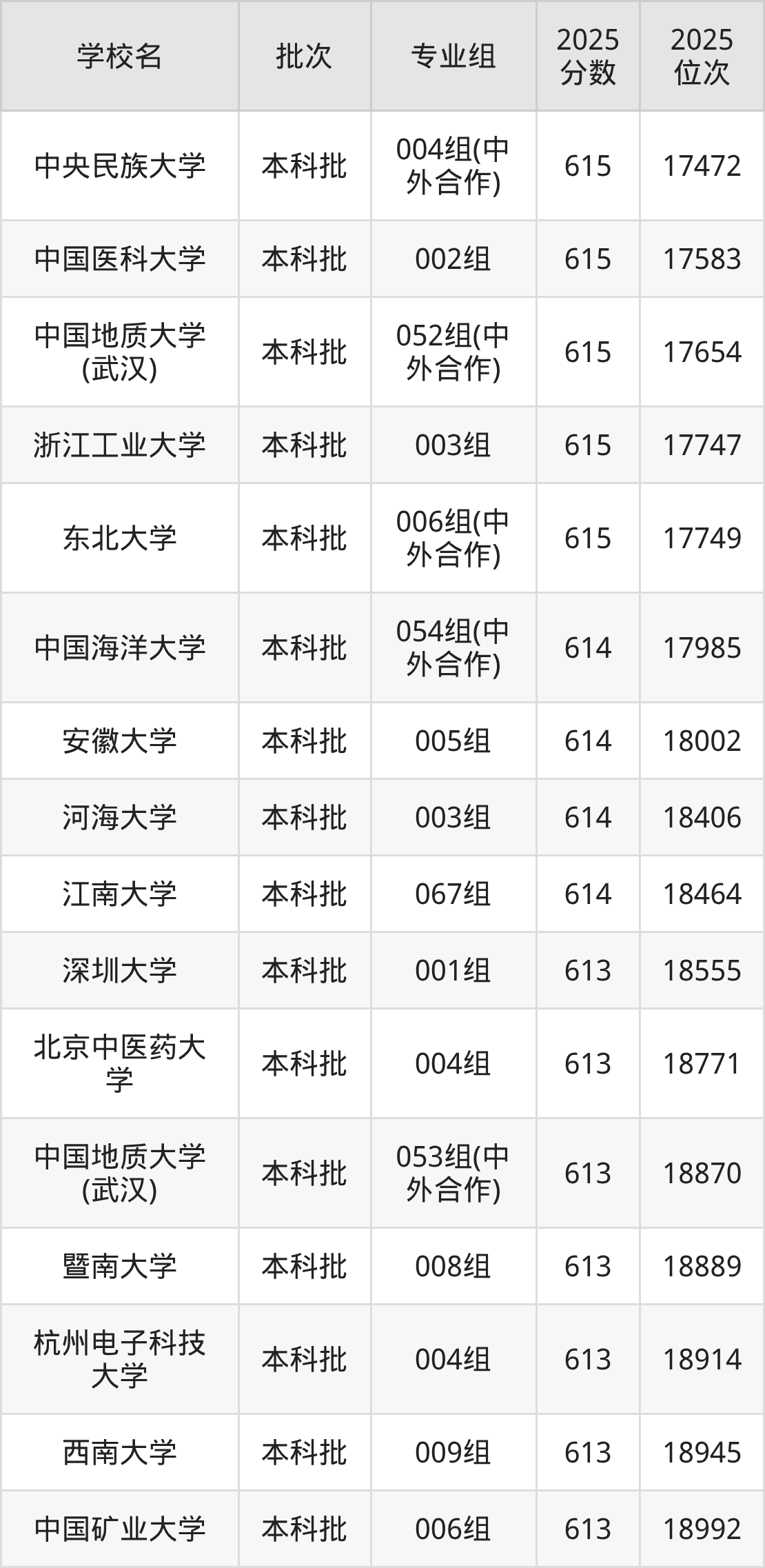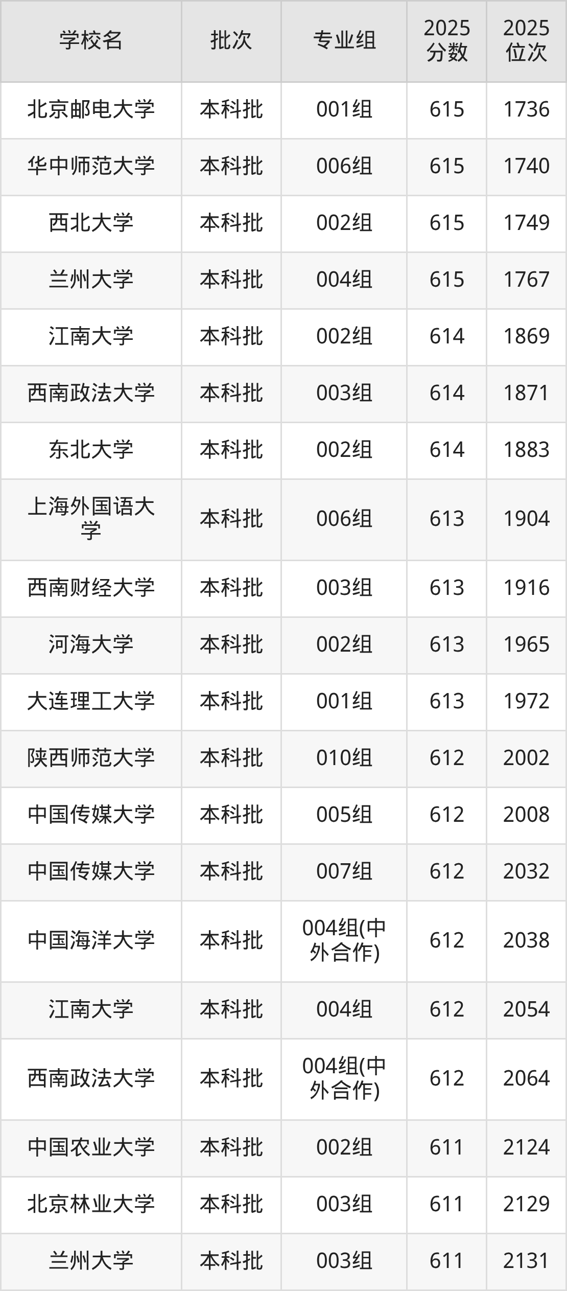 2025年安徽高考历史类614分(1807名~1891名)能上的大学有东北大学002组、江南大学002组、西南政法大学003组。