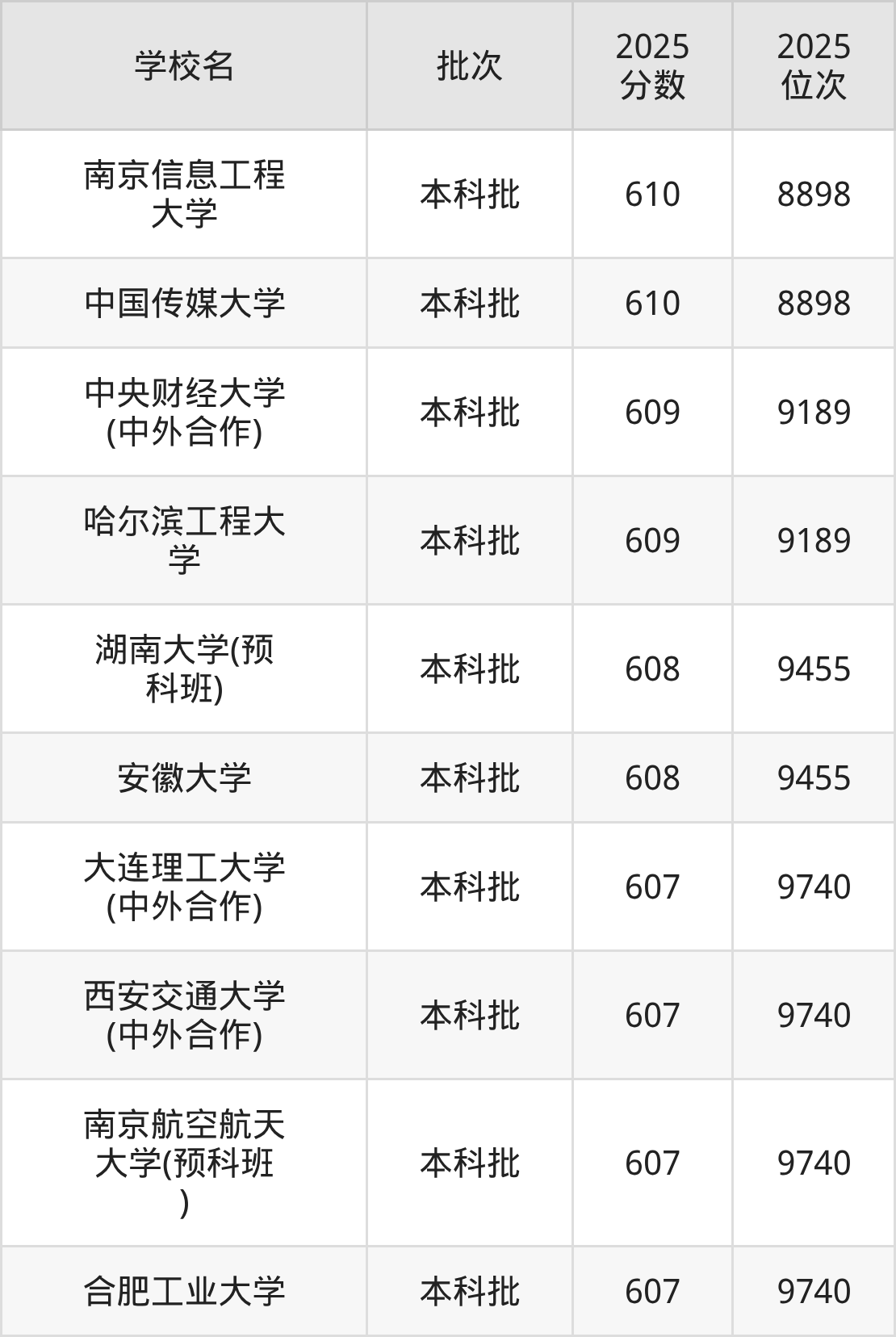 2025年重庆高考物理类608分(9190名~9455名)能上的大学有安徽大学、湖南大学(预科班)。