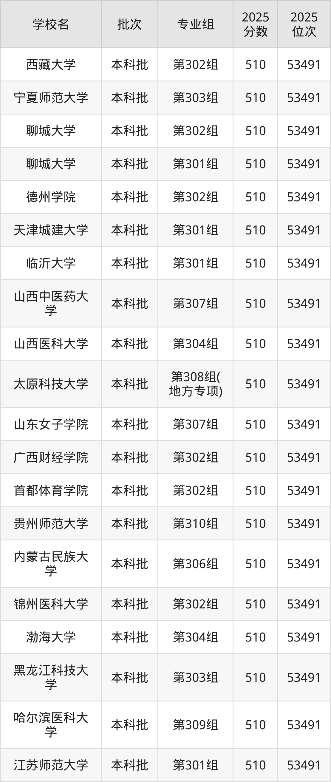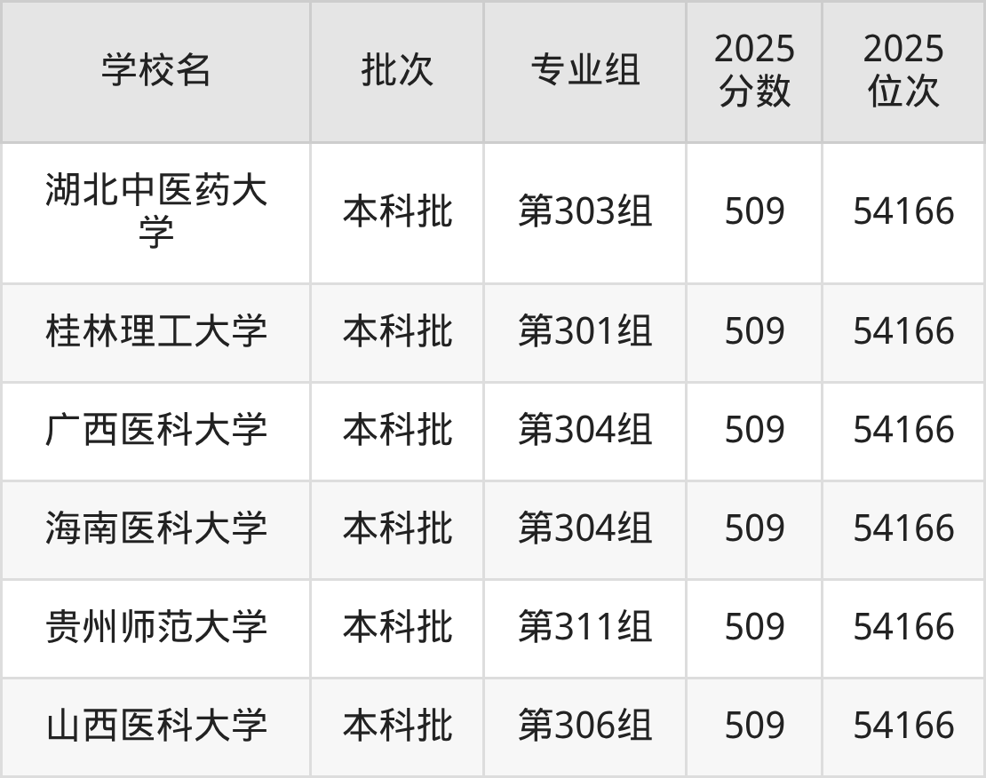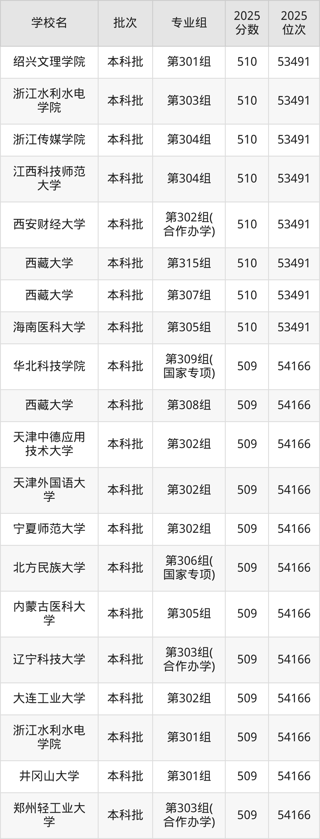 2025年山西高考物理类509分(53492名~54166名)能上的大学有天津外国语大学第302组、天津中德应用技术大学第302组、华北科技学院第309组(国家专项)、内蒙古医科大学第305组等。