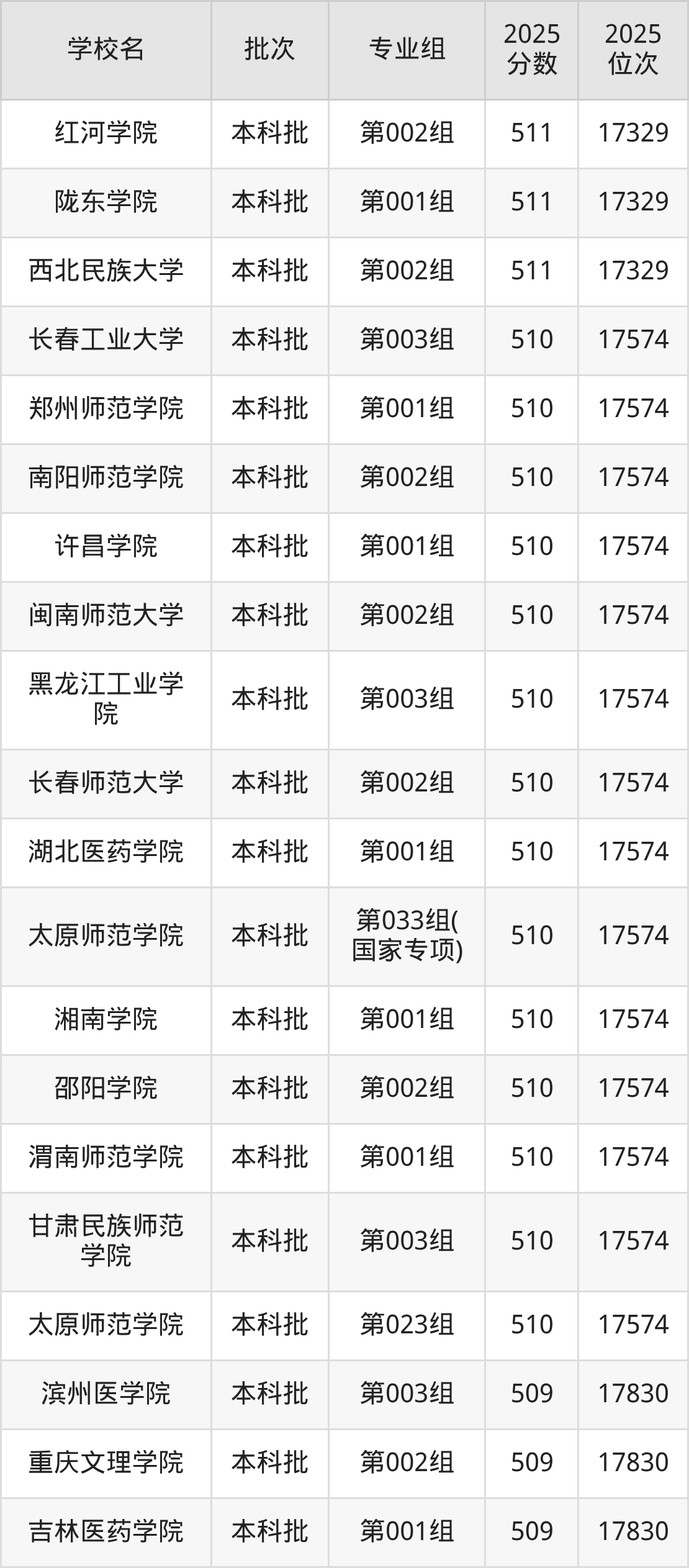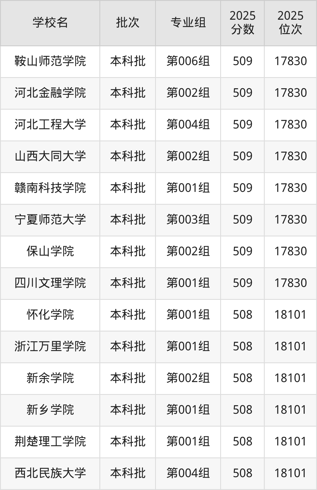 2025年山西高考历史类509分(17575名~17830名)能上的大学有河北工程大学第004组、河北金融学院第002组、鞍山师范学院第006组、吉林医药学院第001组等。