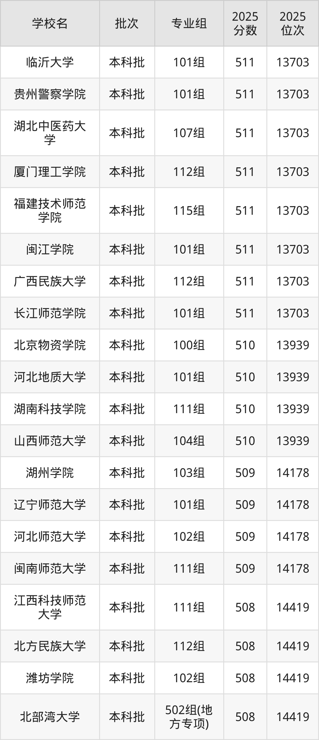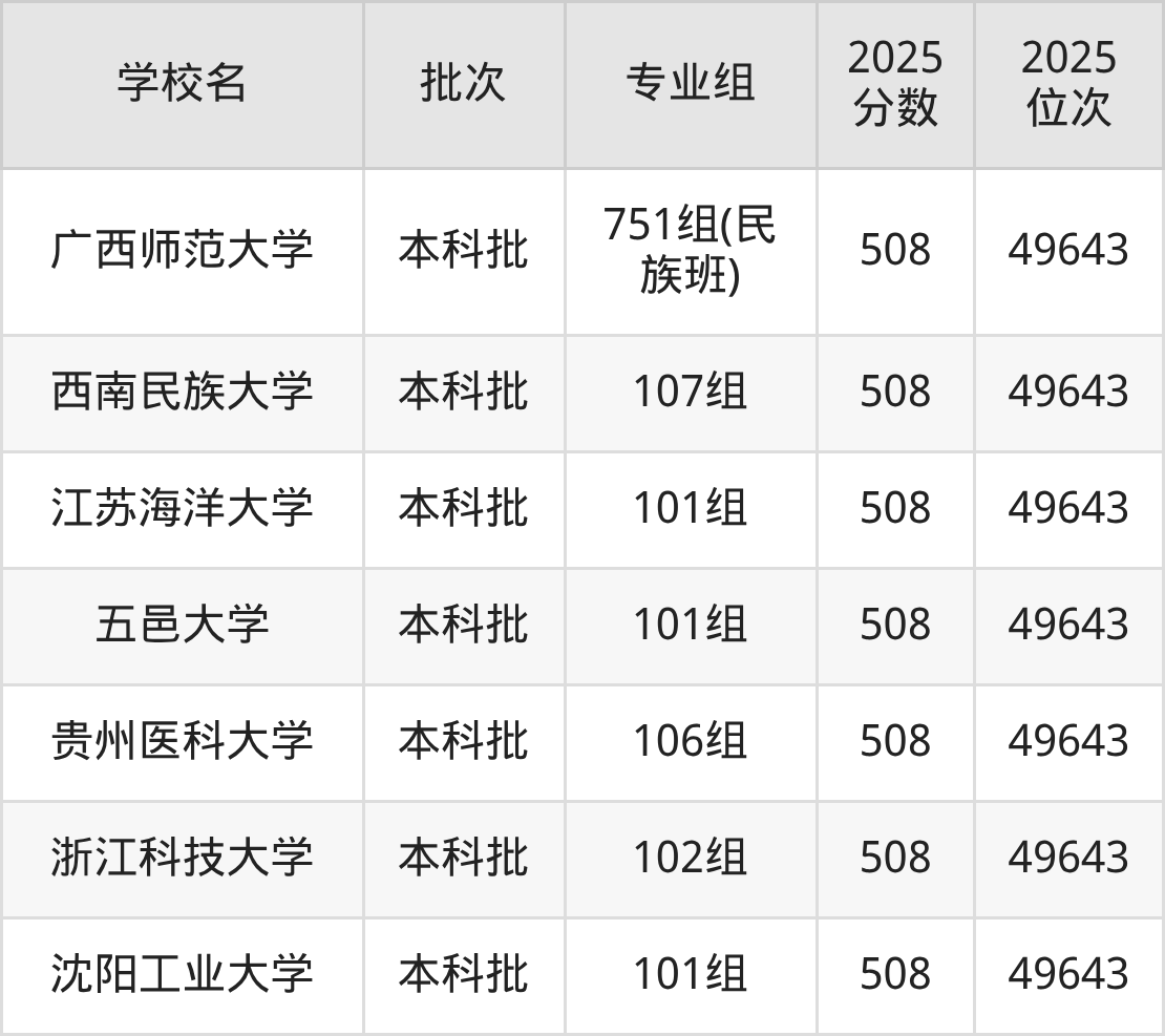 2025年广西高考历史类508分(14179名~14419名)能上的大学有衡阳师范学院101组、潍坊学院102组、江西科技师范大学111组、北方民族大学112组等。