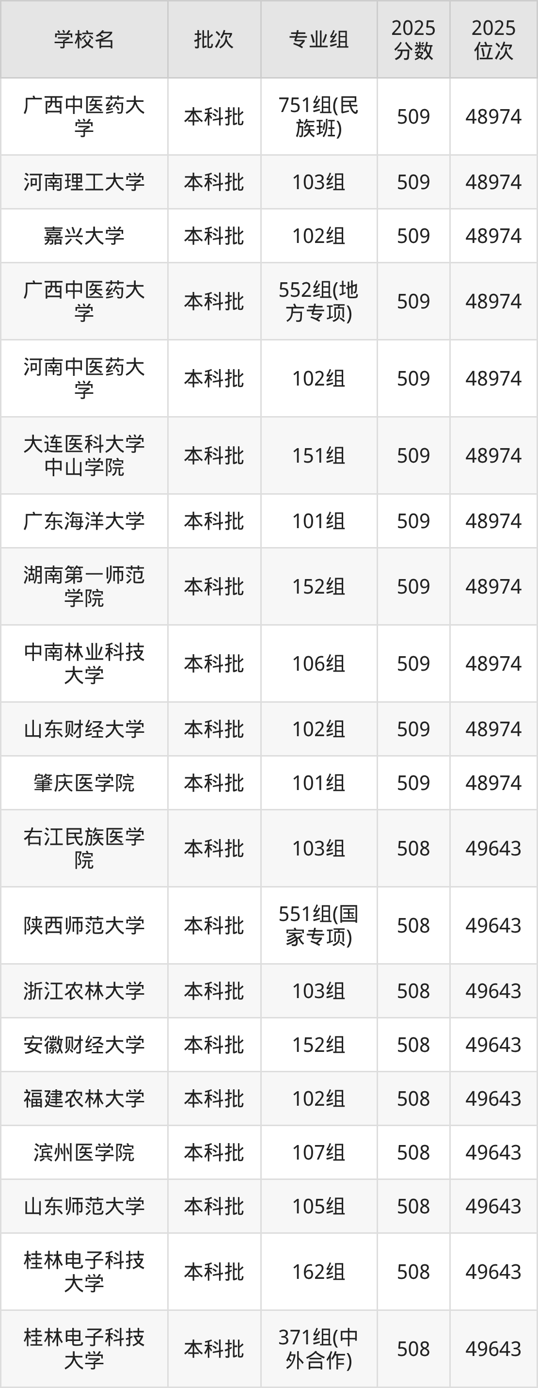 2025年广西高考物理类508分(48975名~49643名)能上的大学有沈阳工业大学101组、浙江农林大学103组、安徽财经大学152组、福建农林大学102组等。