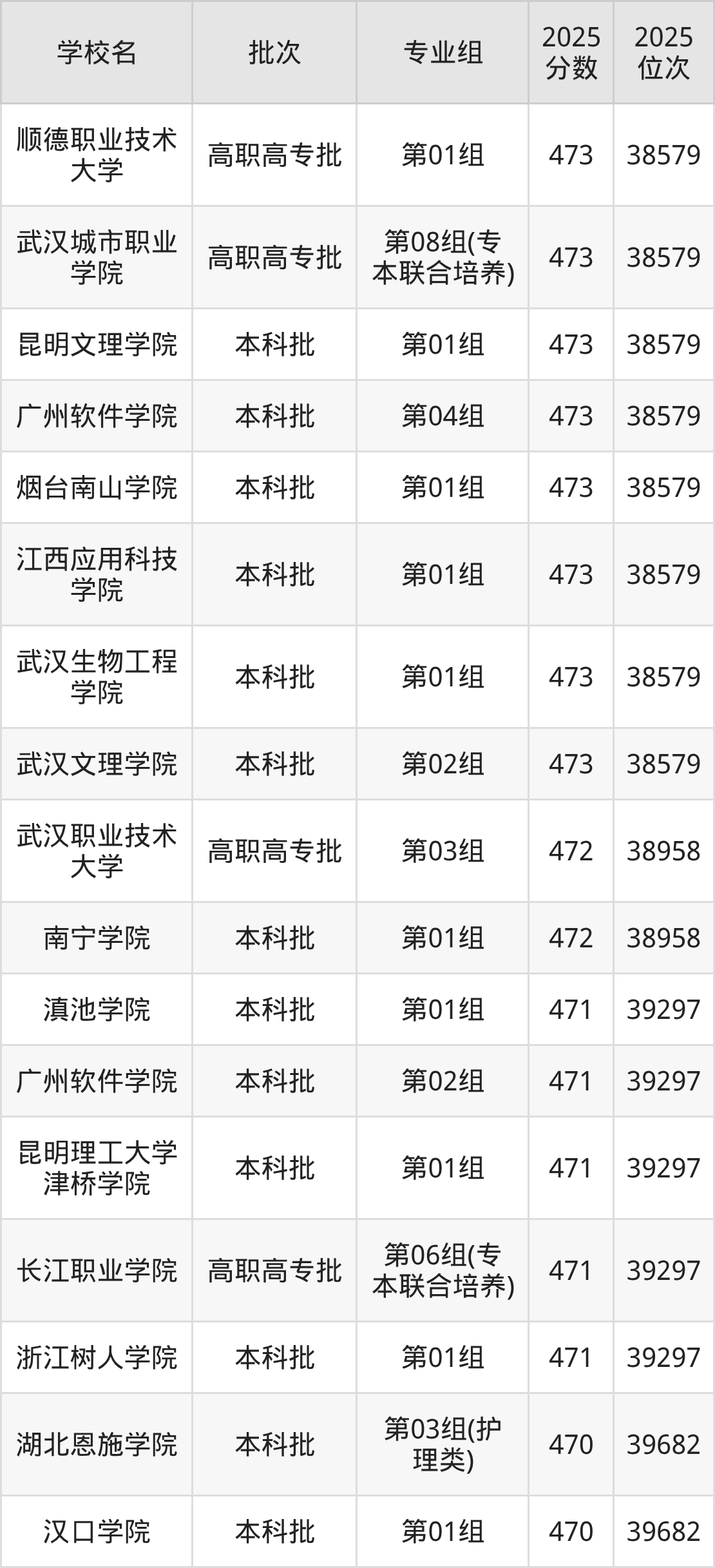 2025年湖北高考历史类471分(38959名~39297名)能上的大学有浙江树人学院第01组、广州软件学院第02组、滇池学院第01组、昆明理工大学津桥学院第01组等。