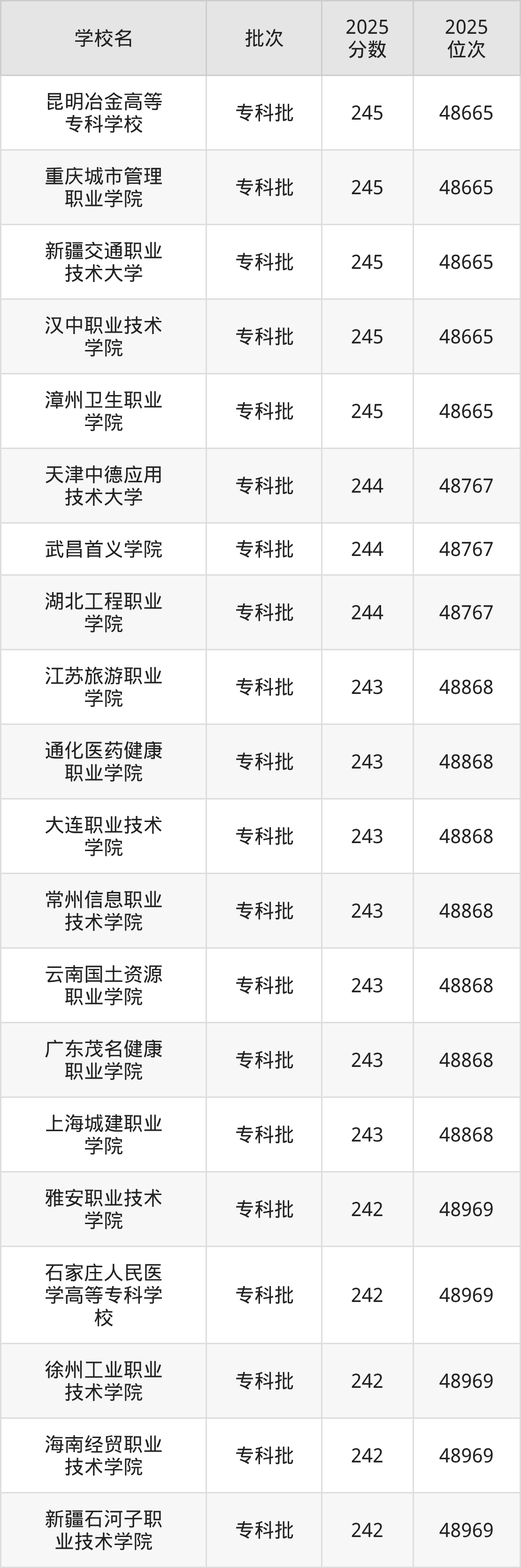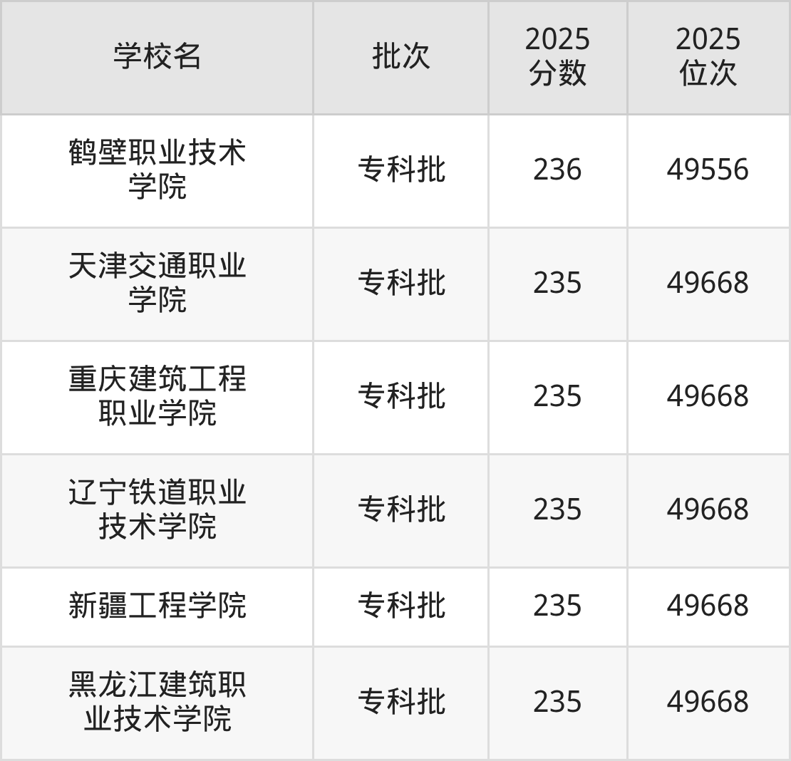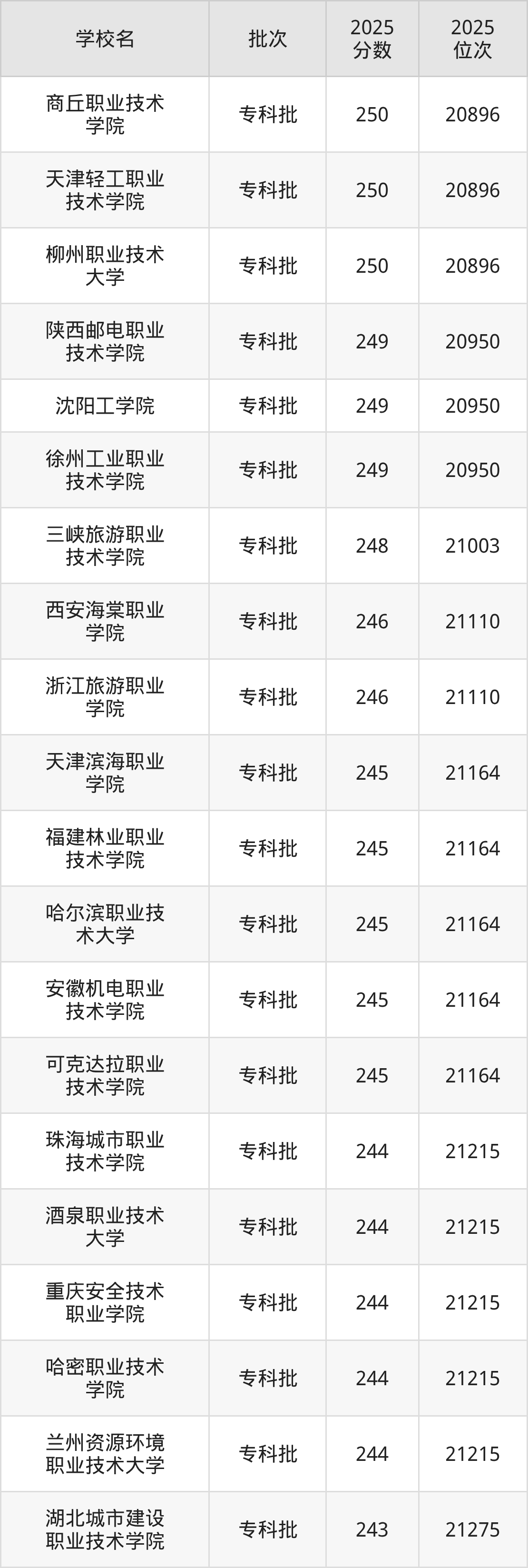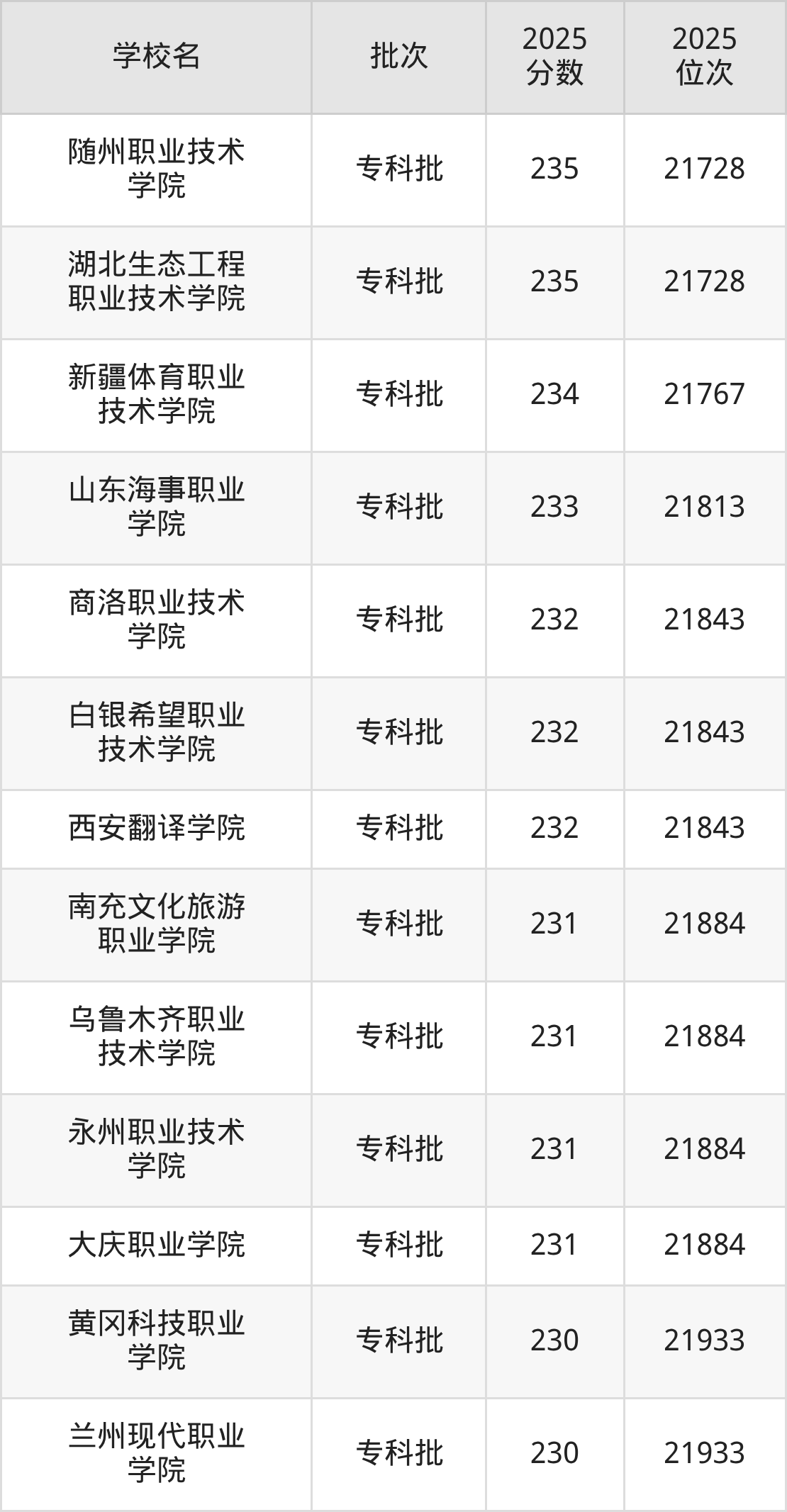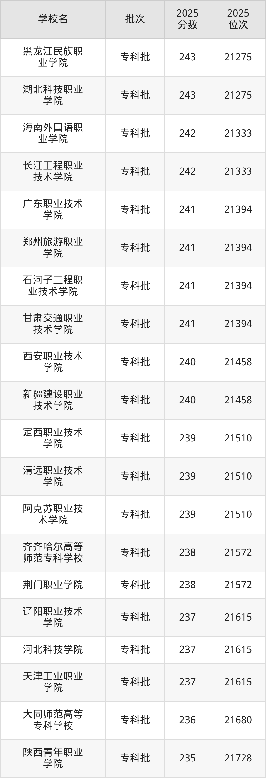 2025年新疆高考文科240分(21395名~21458名)能上的大学有新疆建设职业技术学院、西安职业技术学院。