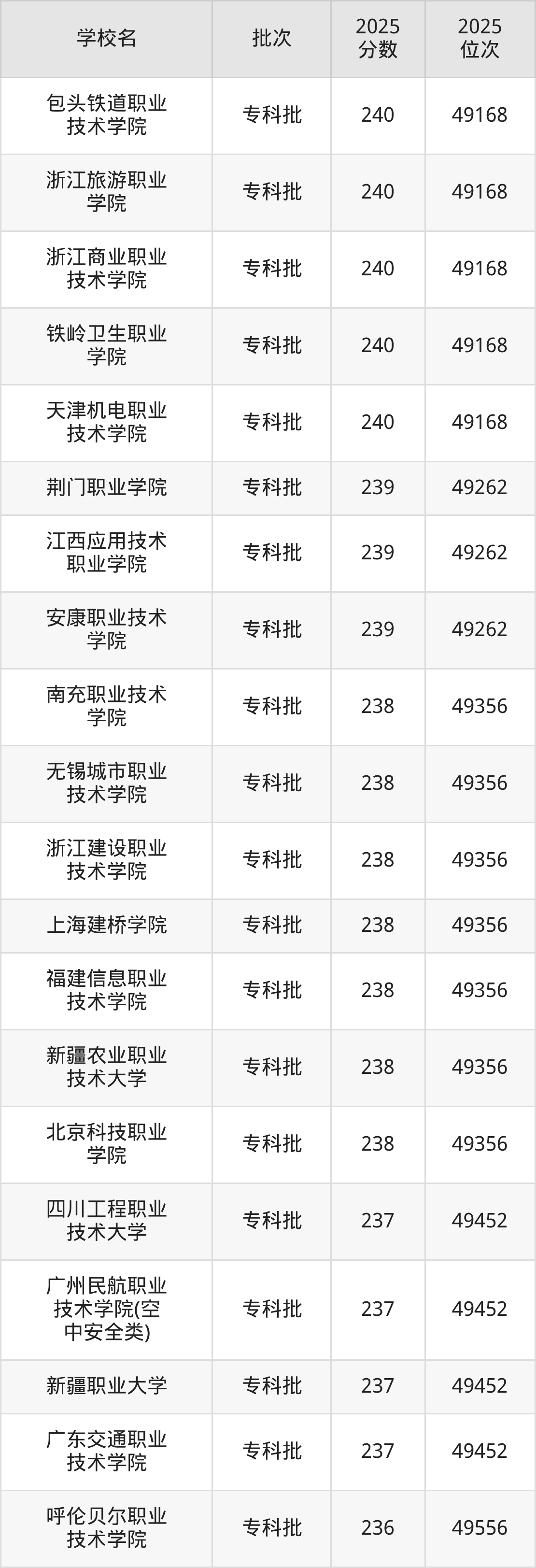 2025年新疆高考理科240分(49071名~49168名)能上的大学有天津机电职业技术学院、浙江商业职业技术学院、浙江旅游职业学院、包头铁道职业技术学院等。