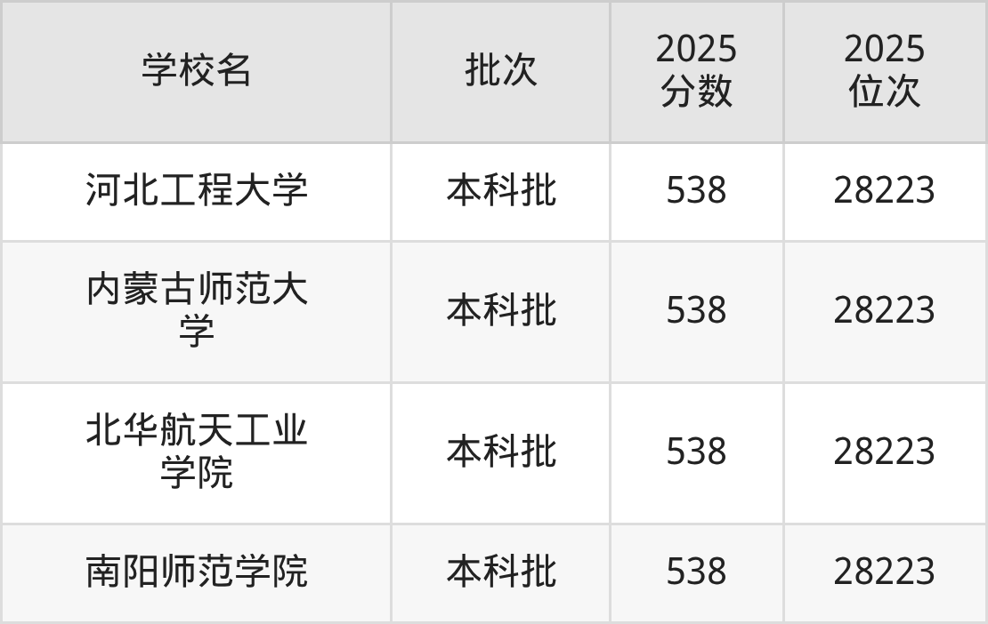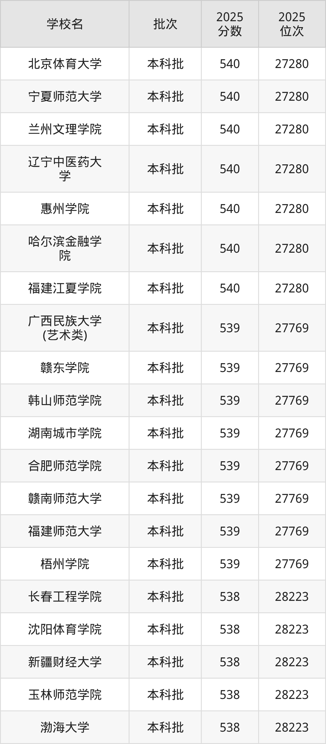 2025年河北高考历史类539分(27281名~27769名)能上的大学有韩山师范学院、湖南城市学院、合肥师范学院、福建师范大学等。