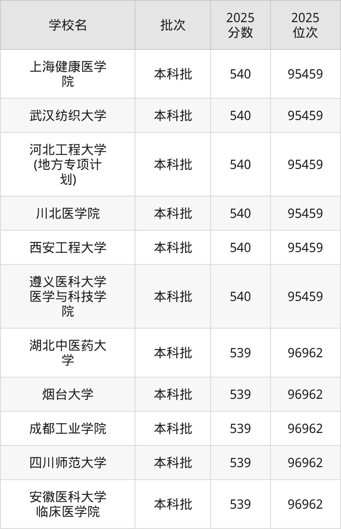2025年河北高考物理类539分(95460名~96962名)能上的大学有安徽医科大学临床医学院、四川师范大学、成都工业学院、烟台大学等。