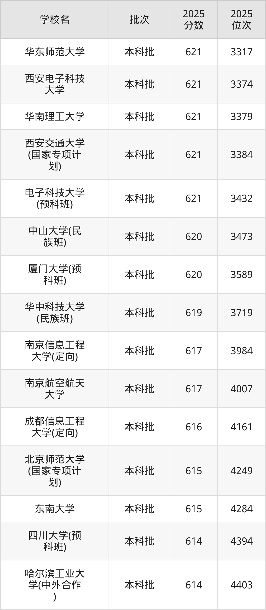 2025年贵州高考物理类618分(3750名~3923名)录取位次低于该区间(较稳妥)的有南京信息工程大学(定向)(3984名)、南京航空航天大学(4007名)等;录取位次高于该区间(可冲)的有华中科技大学(民族班)(3719名)、厦门大学(预科班)(3589名)等。