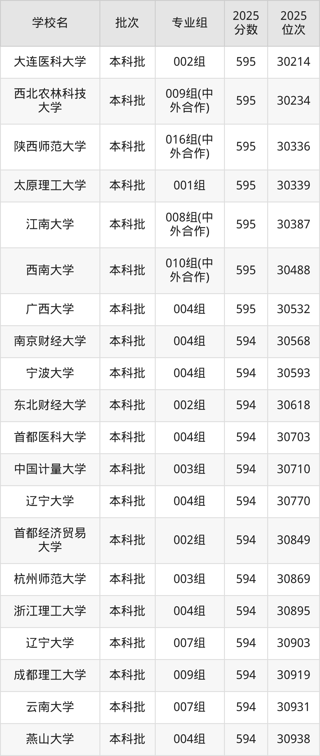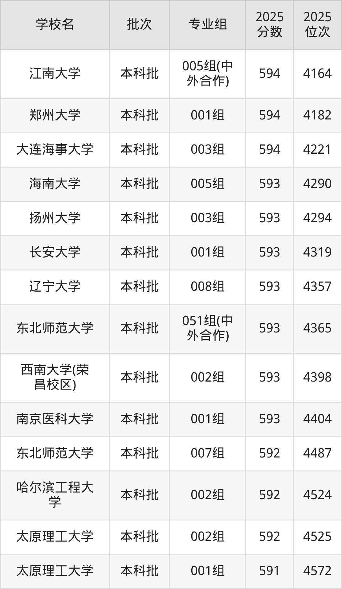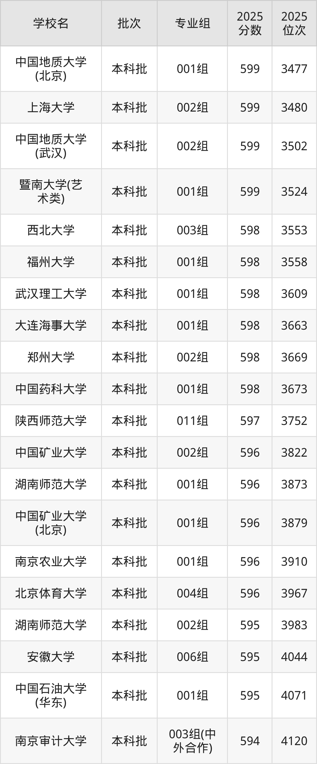 2025年安徽高考历史类595分(3978名~4107名)能上的大学有湖南师范大学002组、中国石油大学(华东)001组、安徽大学006组。