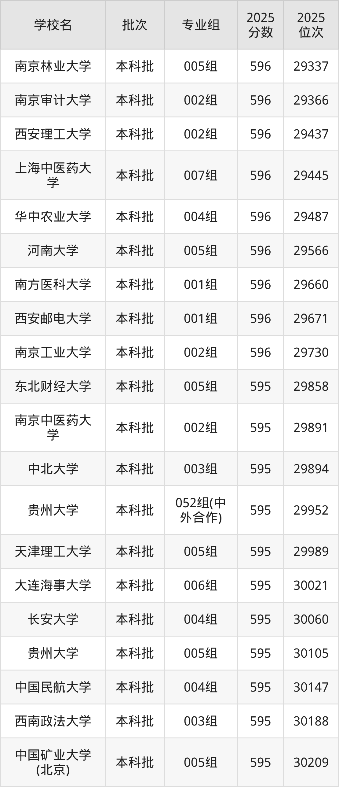 2025年安徽高考物理类595分(29820名~30543名)能上的大学有长安大学004组、大连海事大学006组、大连医科大学002组、东北财经大学005组等。