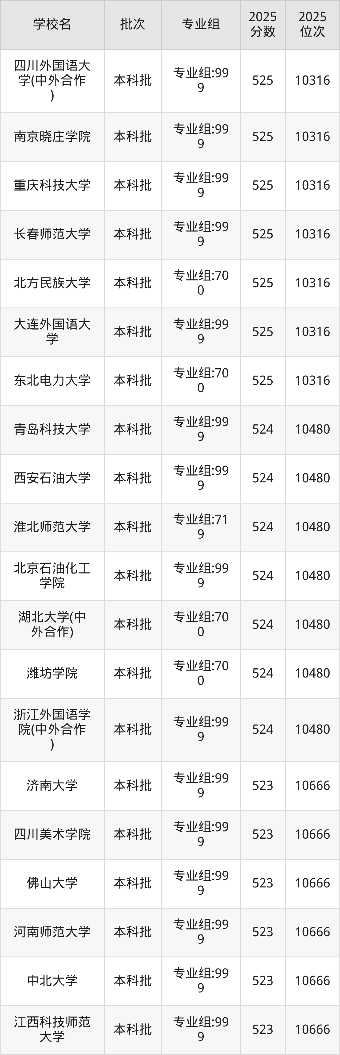 2025年福建高考历史类525分(10172名~10316名)能上的大学有北方民族大学专业组:700、长春师范大学专业组:999、重庆科技大学专业组:999、大连外国语大学专业组:999等。