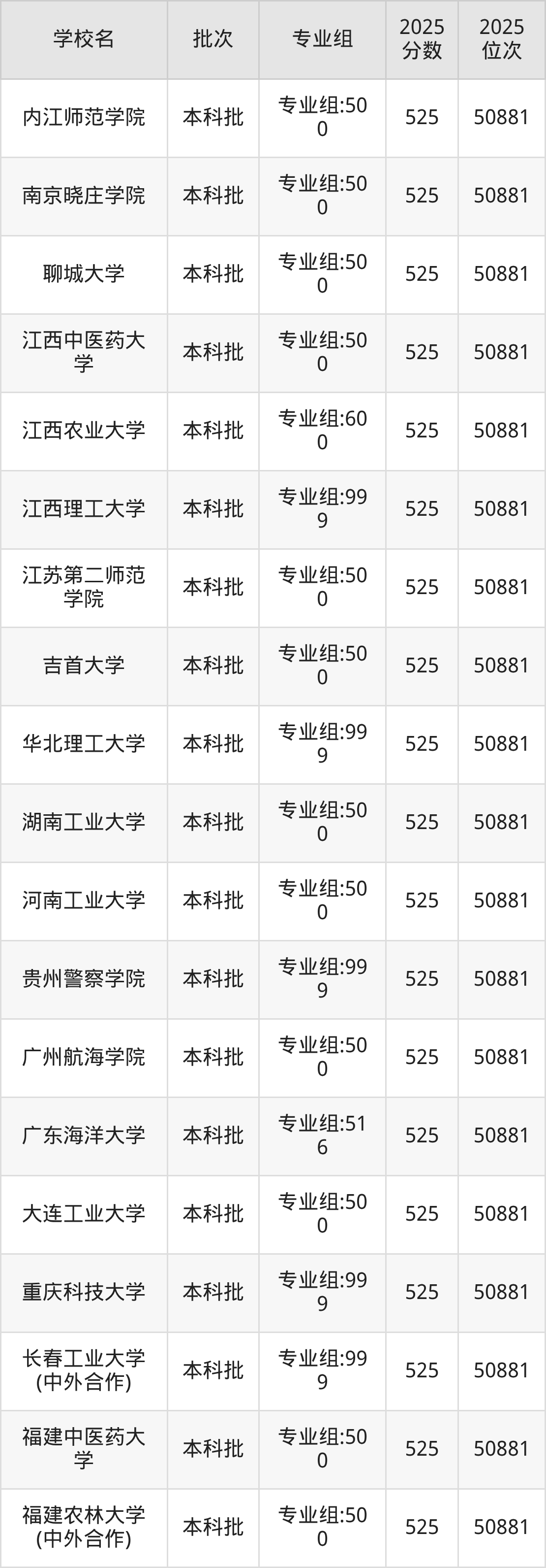 2025年福建高考物理类525分(50185名~50881名)能上的大学有福建农林大学(中外合作)专业组:500、福建中医药大学专业组:500、长春工业大学(中外合作)专业组:999、重庆科技大学专业组:999等。