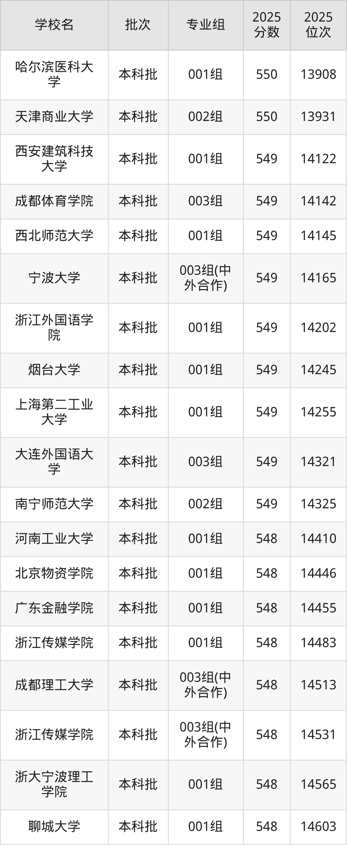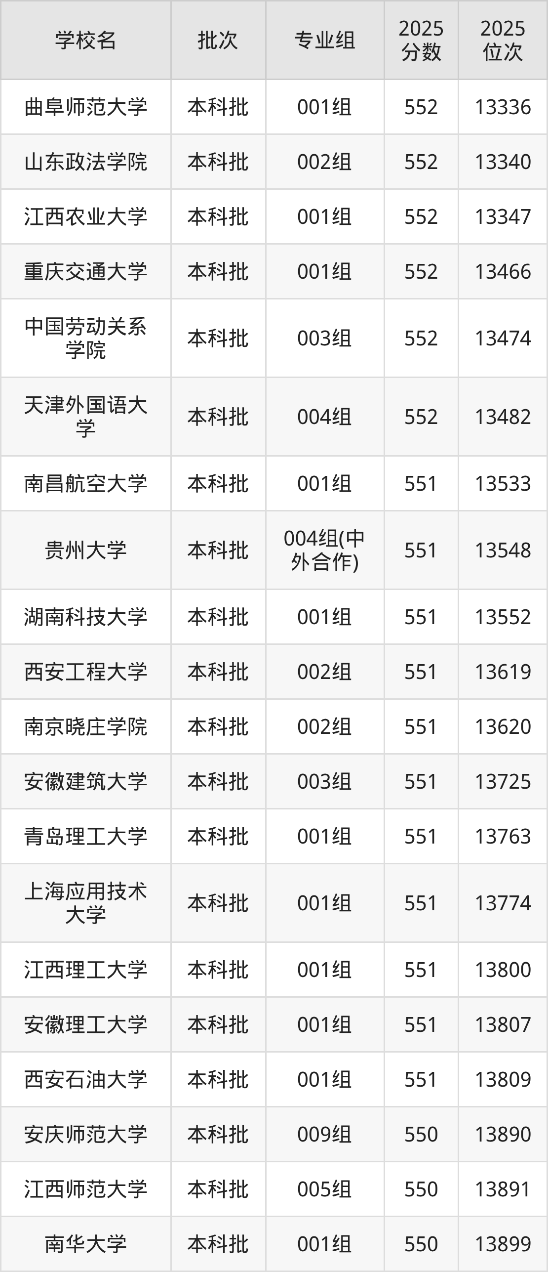 2025年安徽高考历史类550分(13810名~14109名)能上的大学有哈尔滨医科大学001组、江西师范大学005组、南华大学001组、天津商业大学002组等。