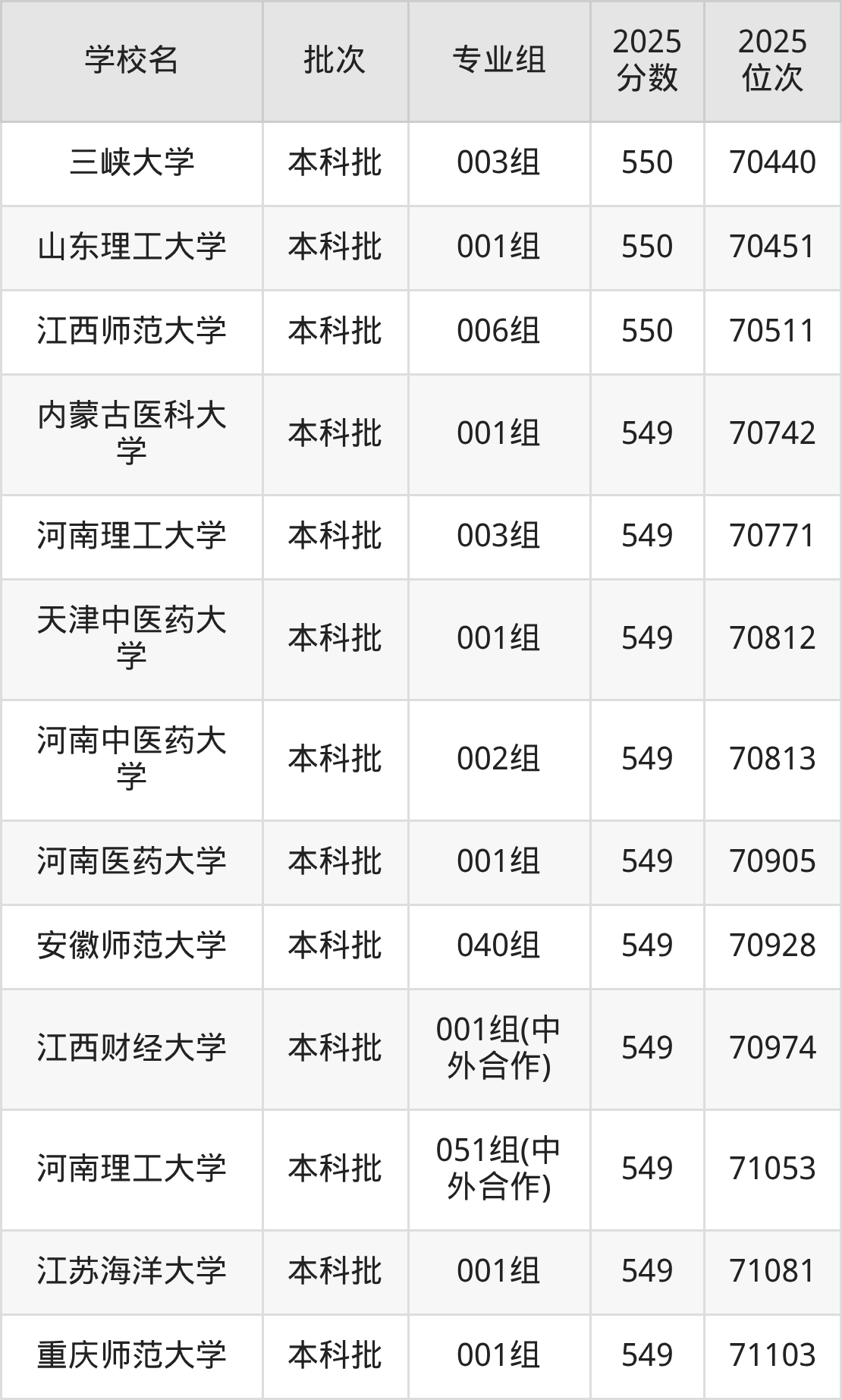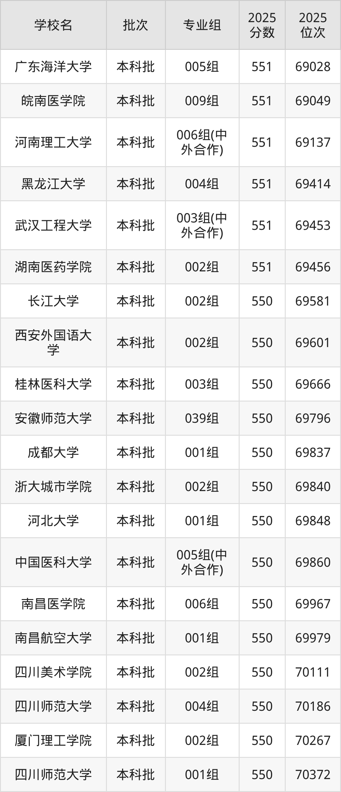 2025年安徽高考物理类550分(69513名~70614名)能上的大学有长江大学002组、成都大学001组、桂林医科大学003组、河北大学001组等。