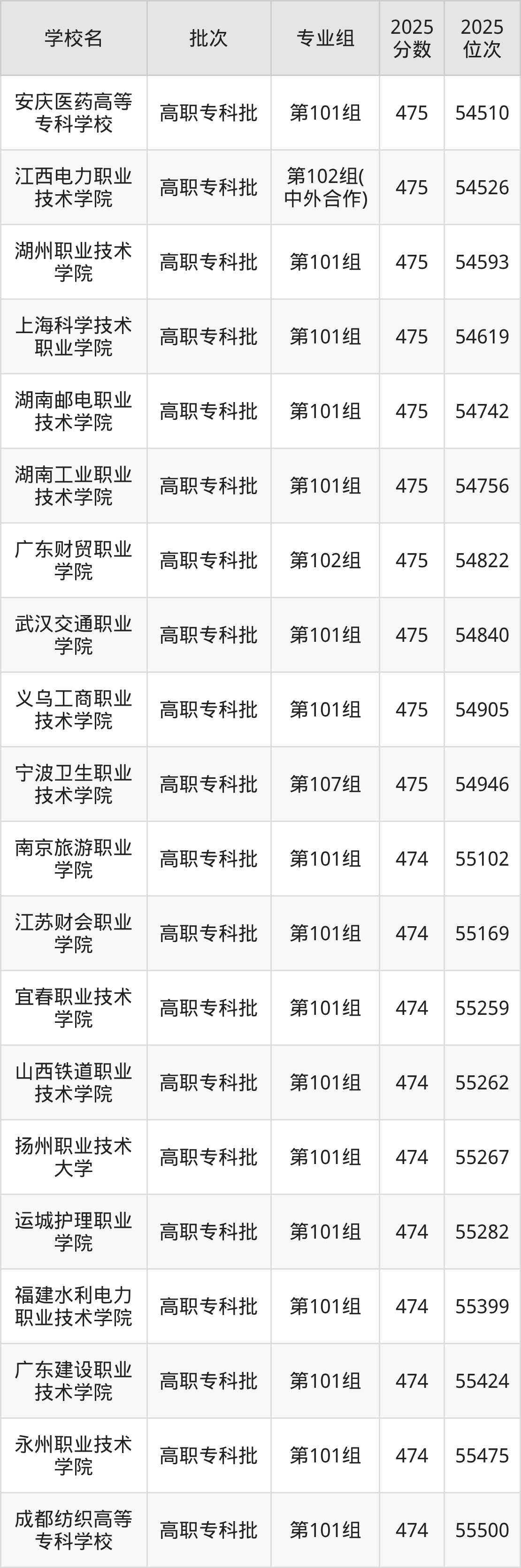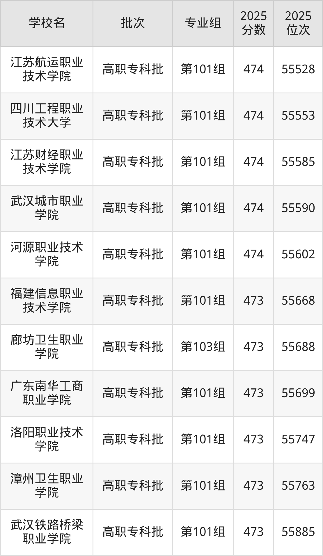 2025年江西高考历史类474分(54998名~55660名)能上的大学有成都纺织高等专科学校第101组、山西铁道职业技术学院第101组、江苏财经职业技术学院第101组、南京旅游职业学院第101组等。
