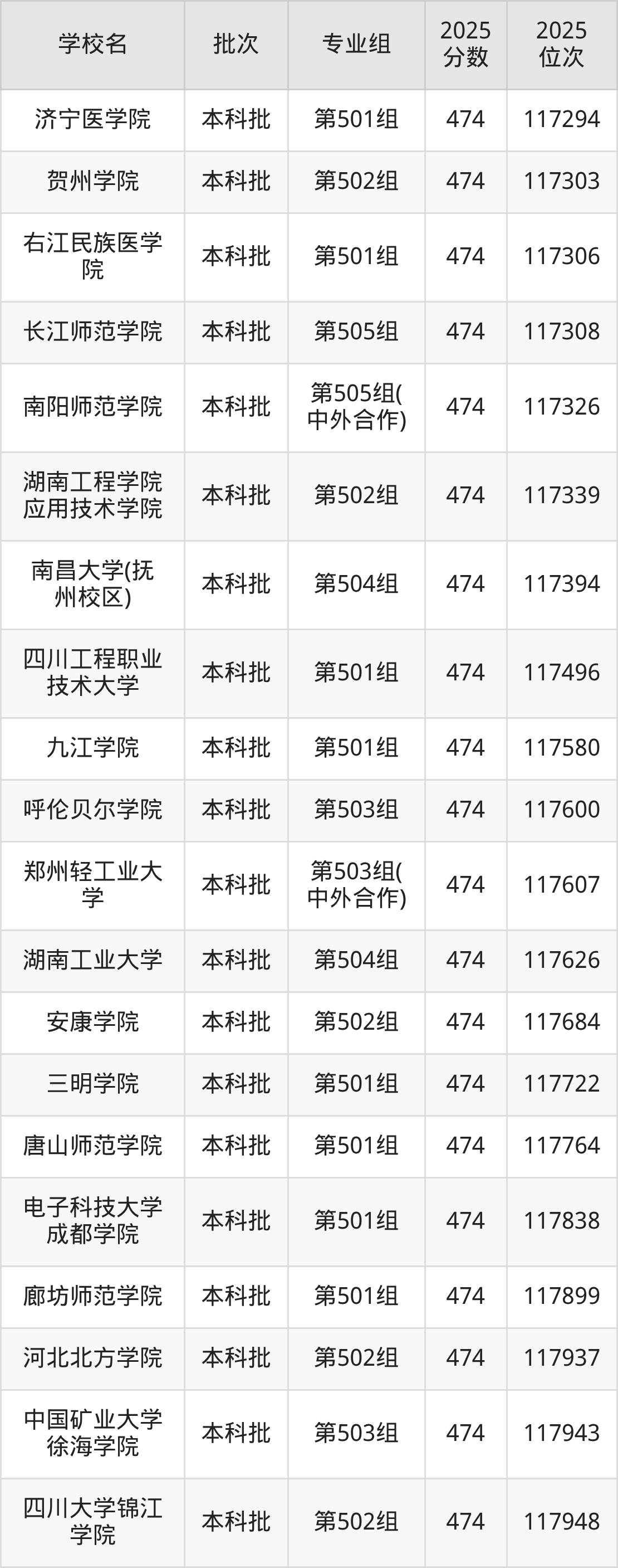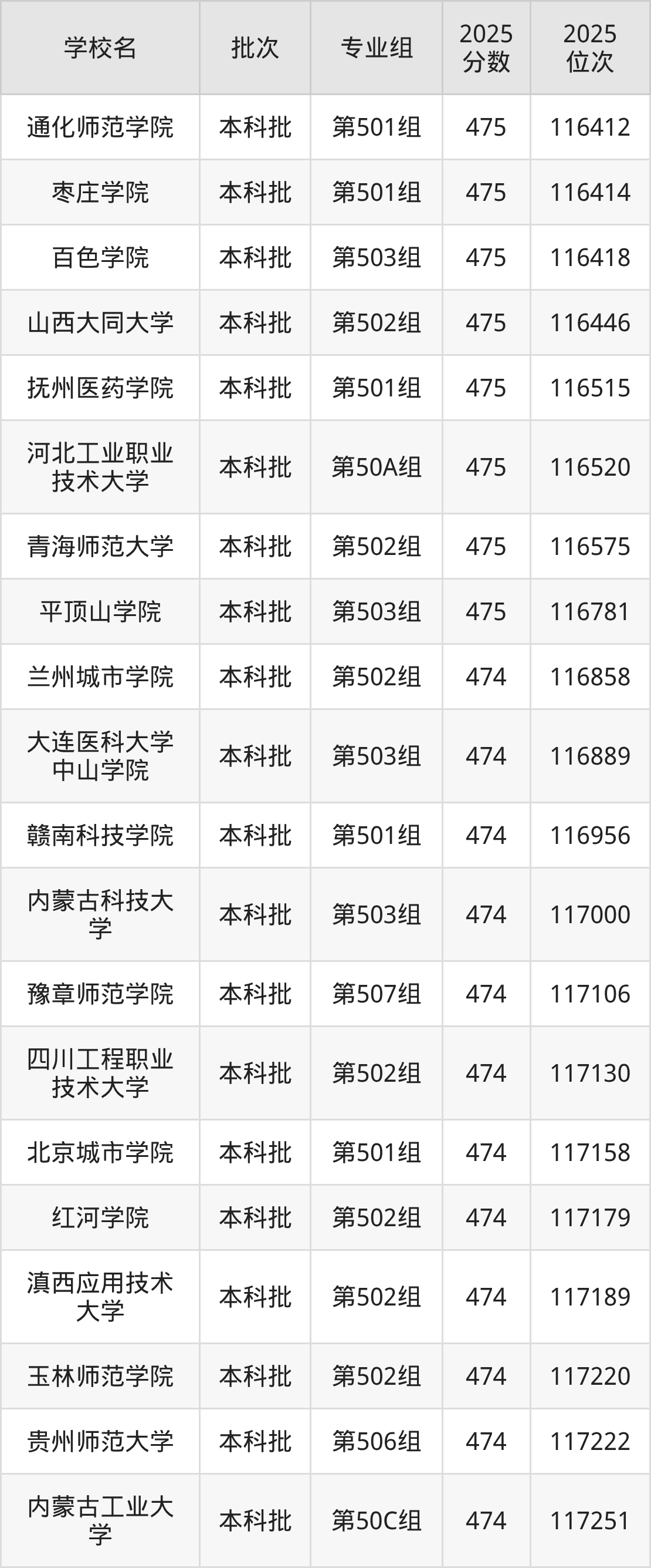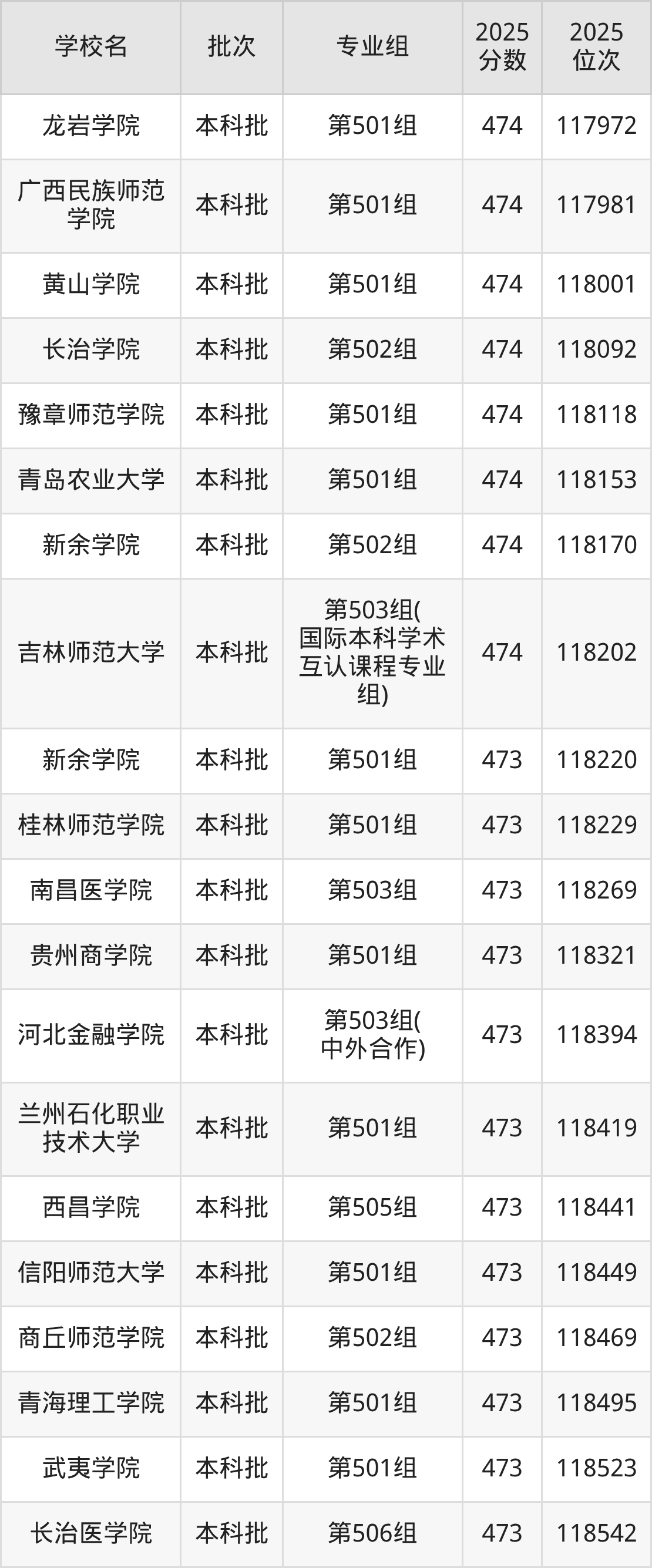 2025年江西高考物理类474分(116850名~118215名)能上的大学有吉林师范大学第503组(国际本科学术互认课程专业组)、贵州师范大学第506组、北京城市学院第501组、廊坊师范学院第501组等。