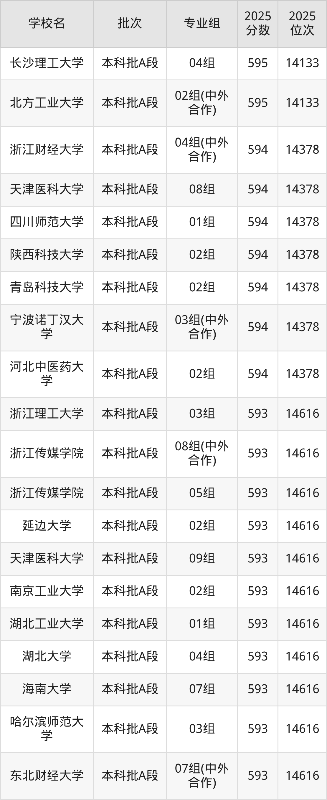 2025年天津高考593分(14379名~14616名)能上的大学有东北财经大学07组(中外合作)、哈尔滨师范大学03组、海南大学07组、湖北大学04组等。