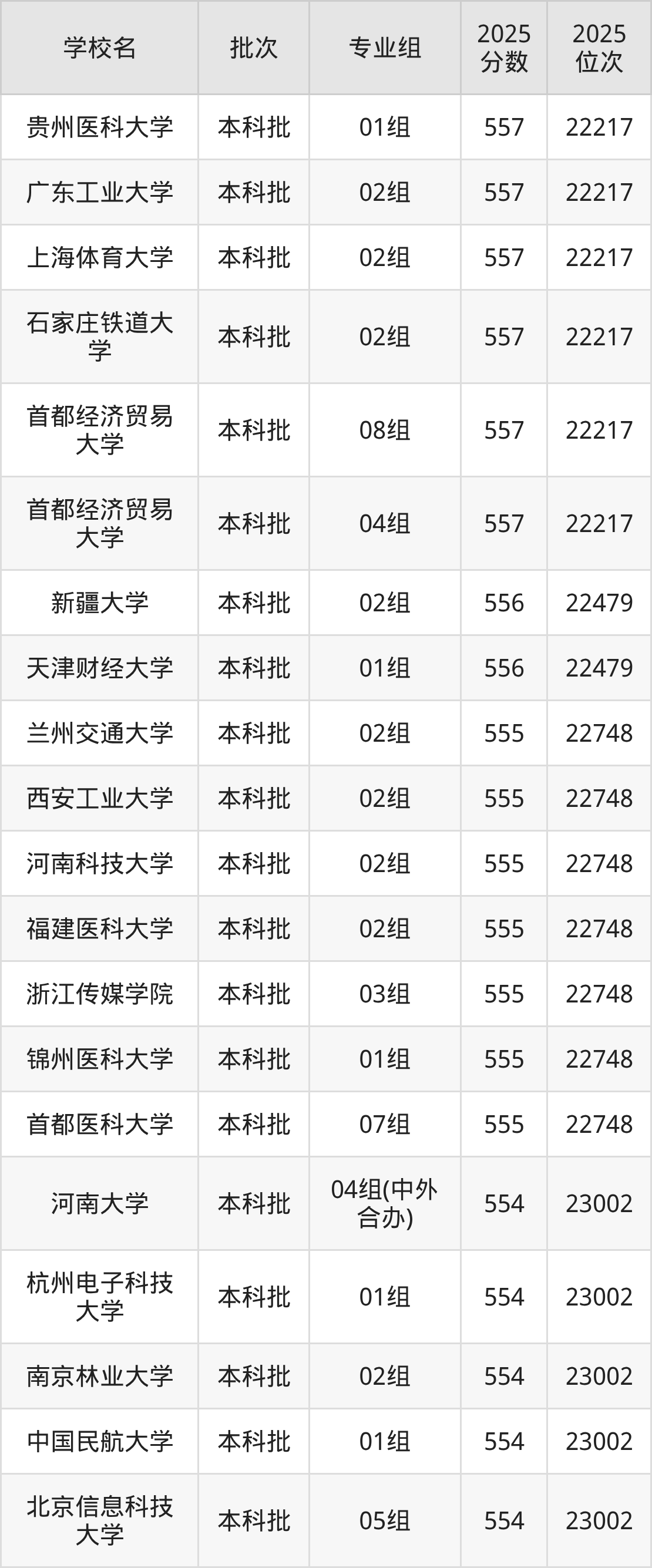 2025年北京高考555分(22480名~22748名)能上的大学有首都医科大学07组、锦州医科大学01组、浙江传媒学院03组、福建医科大学02组等。