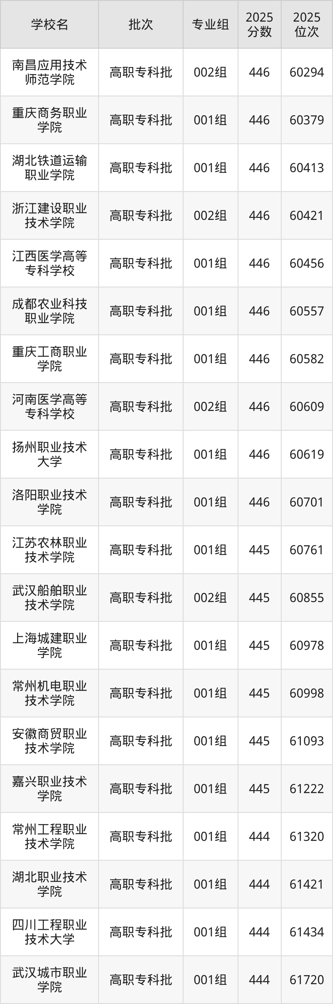 2025年安徽高考历史类445分(60742名~61242名)能上的大学有常州机电职业技术学院001组、嘉兴职业技术学院001组、江苏农林职业技术学院001组、上海城建职业学院001组等。
