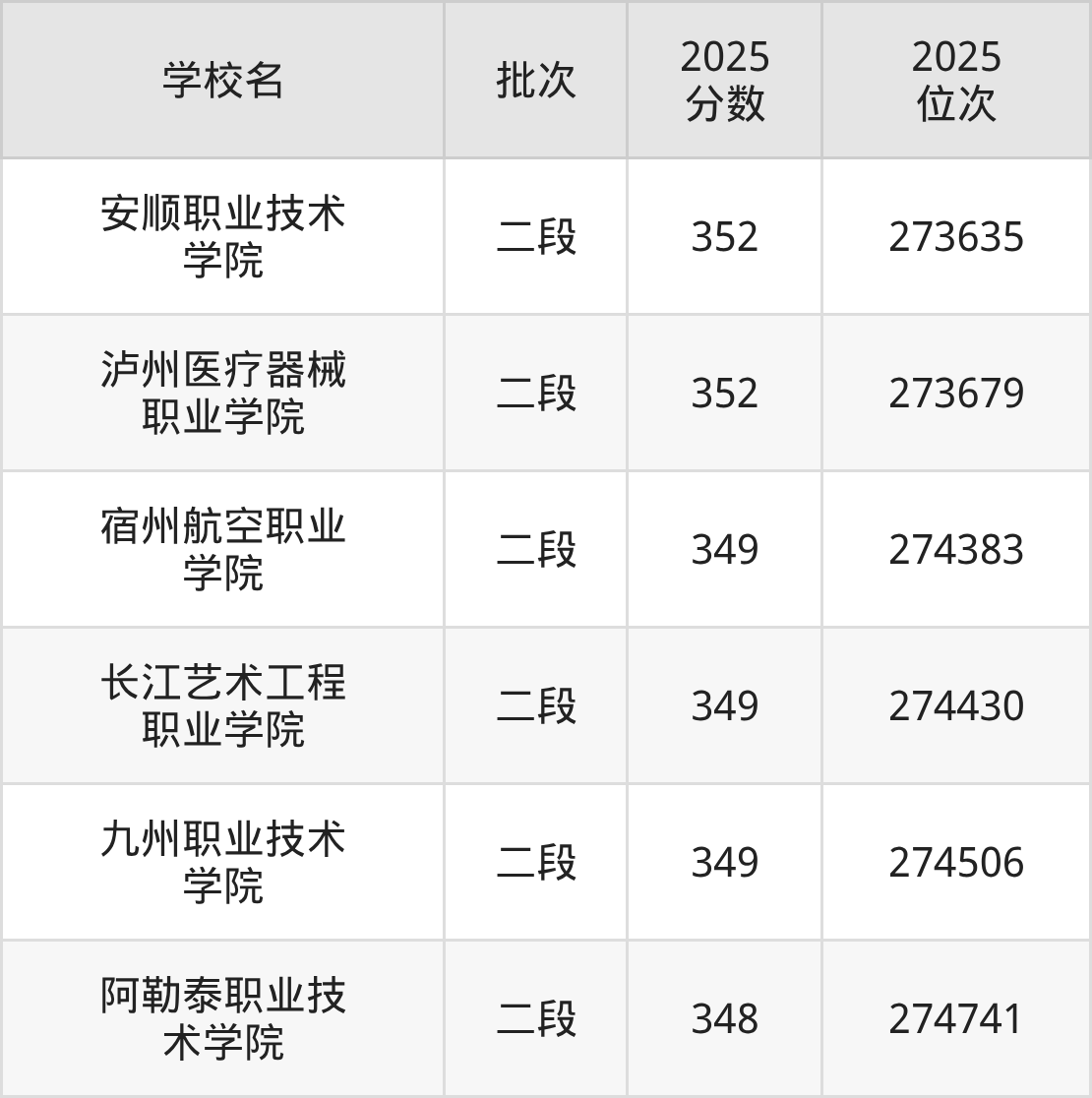 2025年浙江高考350分(274080名~274352名)录取位次低于该区间(较稳妥)的有宿州航空职业学院(274383名)、长江艺术工程职业学院(274430名)等;录取位次高于该区间(可冲)的有泸州医疗器械职业学院(273679名)、安顺职业技术学院(273635名)等。