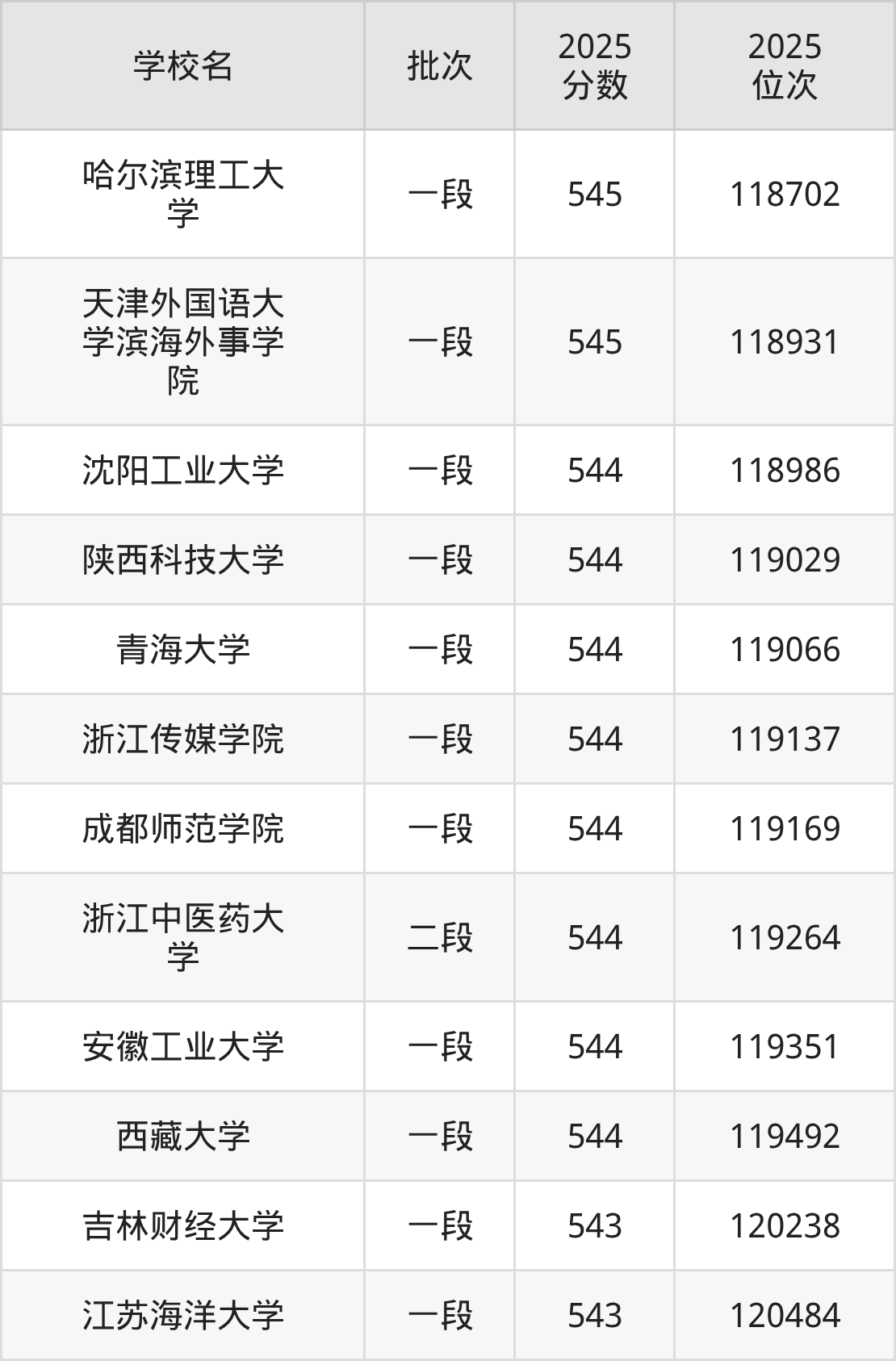2025年浙江高考544分(118978名~120176名)能上的大学有浙江中医药大学、安徽工业大学、成都师范学院、沈阳工业大学等。