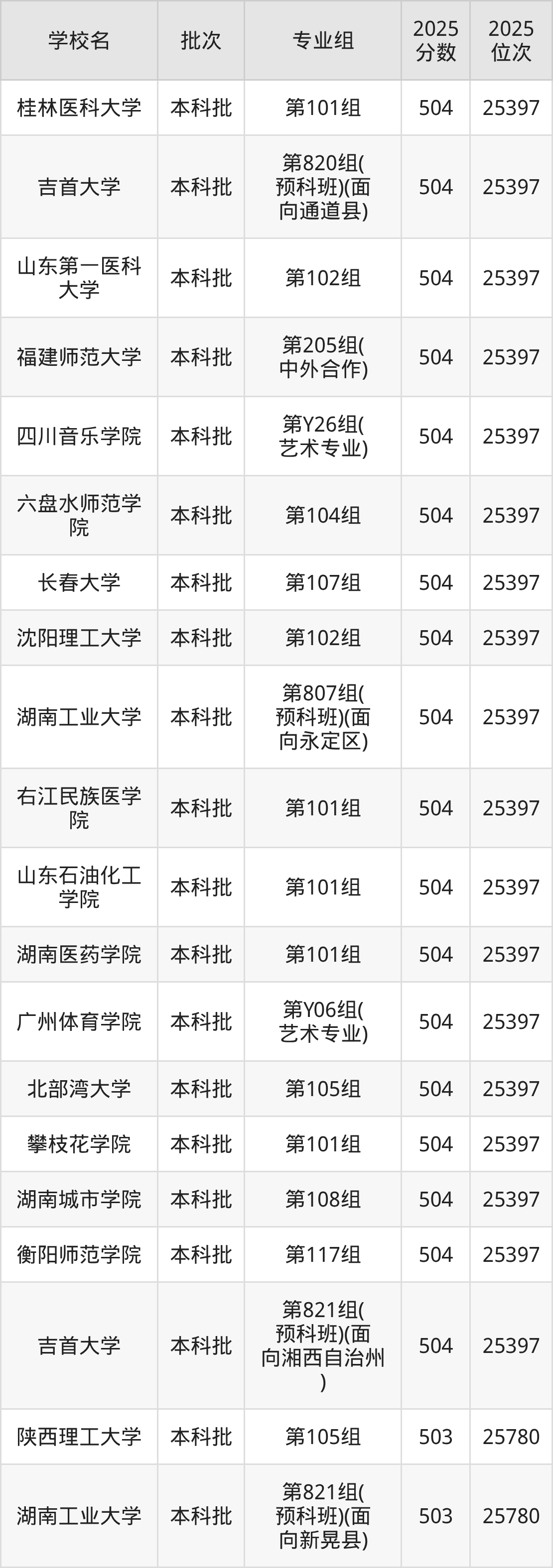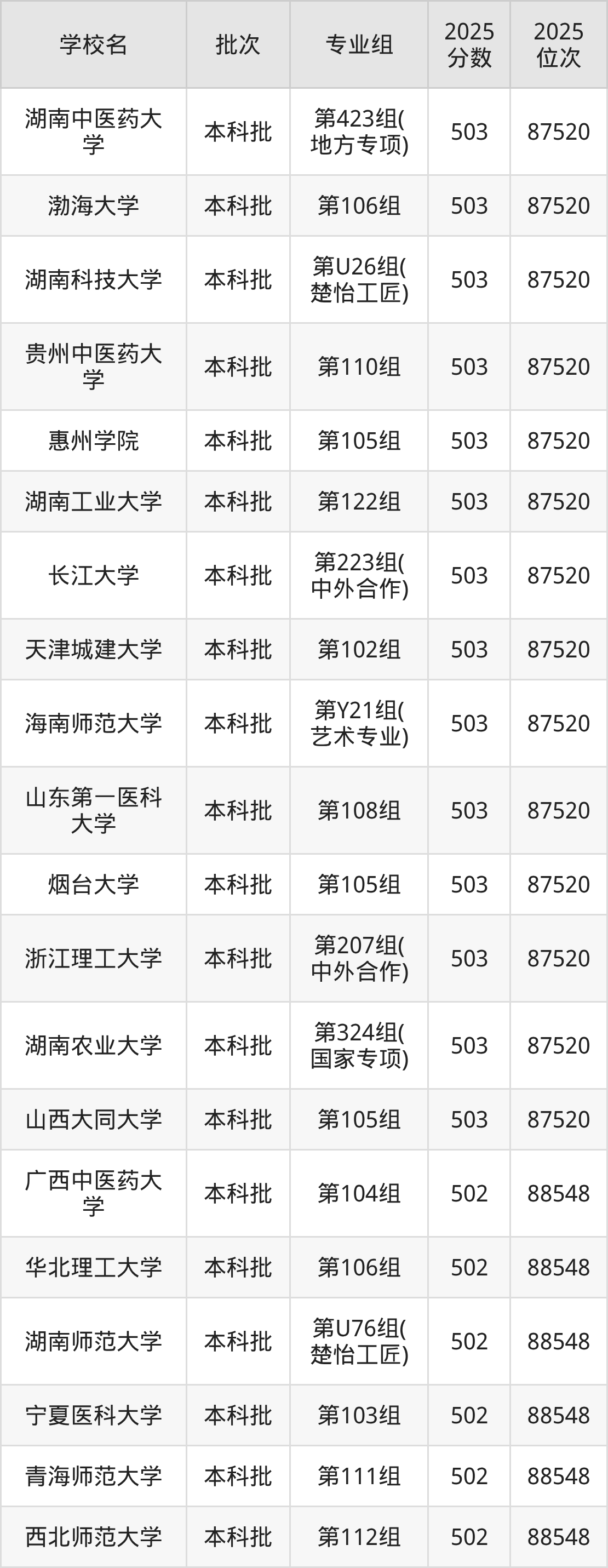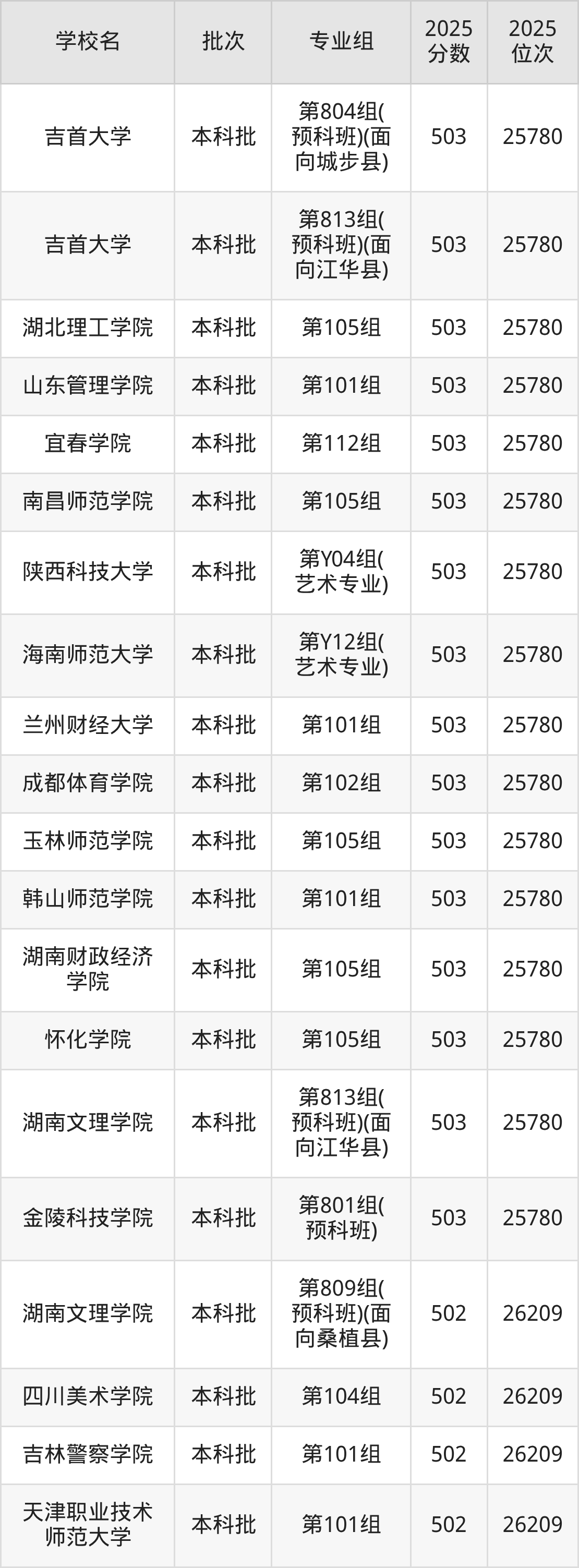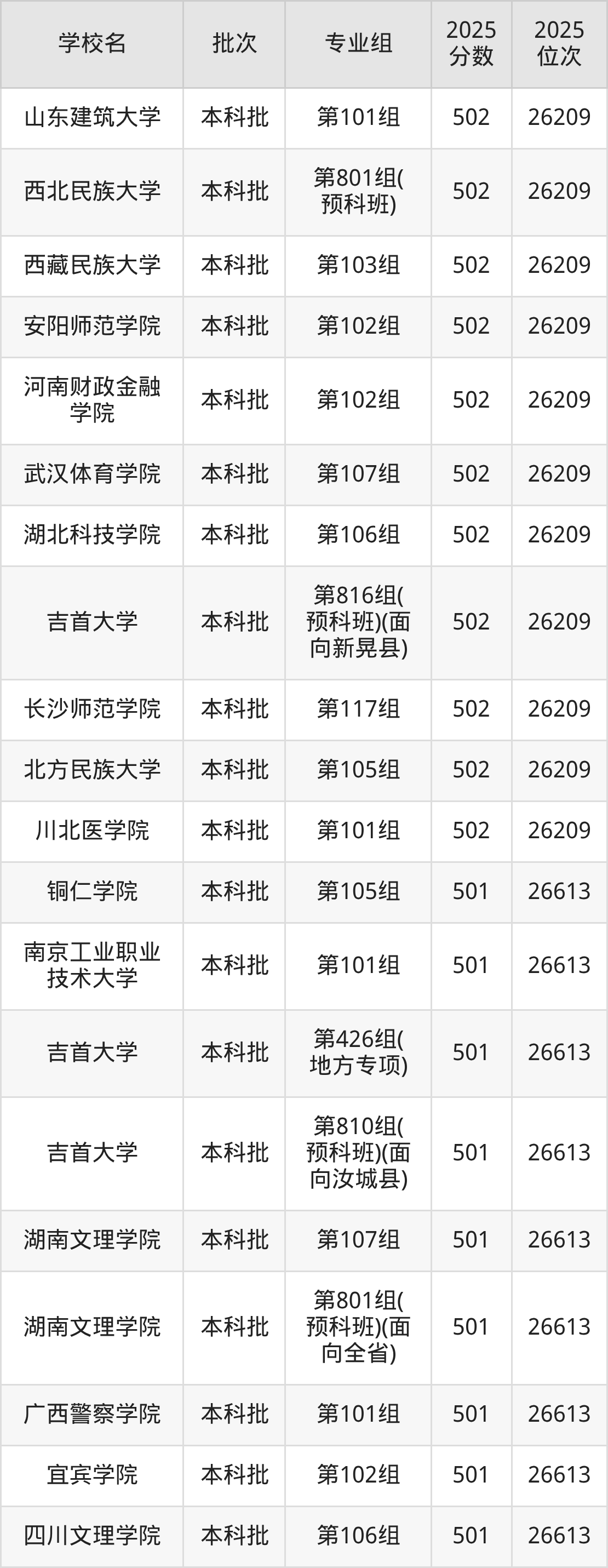 2025年湖南高考历史类502分(25781名~26209名)能上的大学有天津职业技术师范大学第101组、吉林警察学院第101组、山东建筑大学第101组、安阳师范学院第102组等。