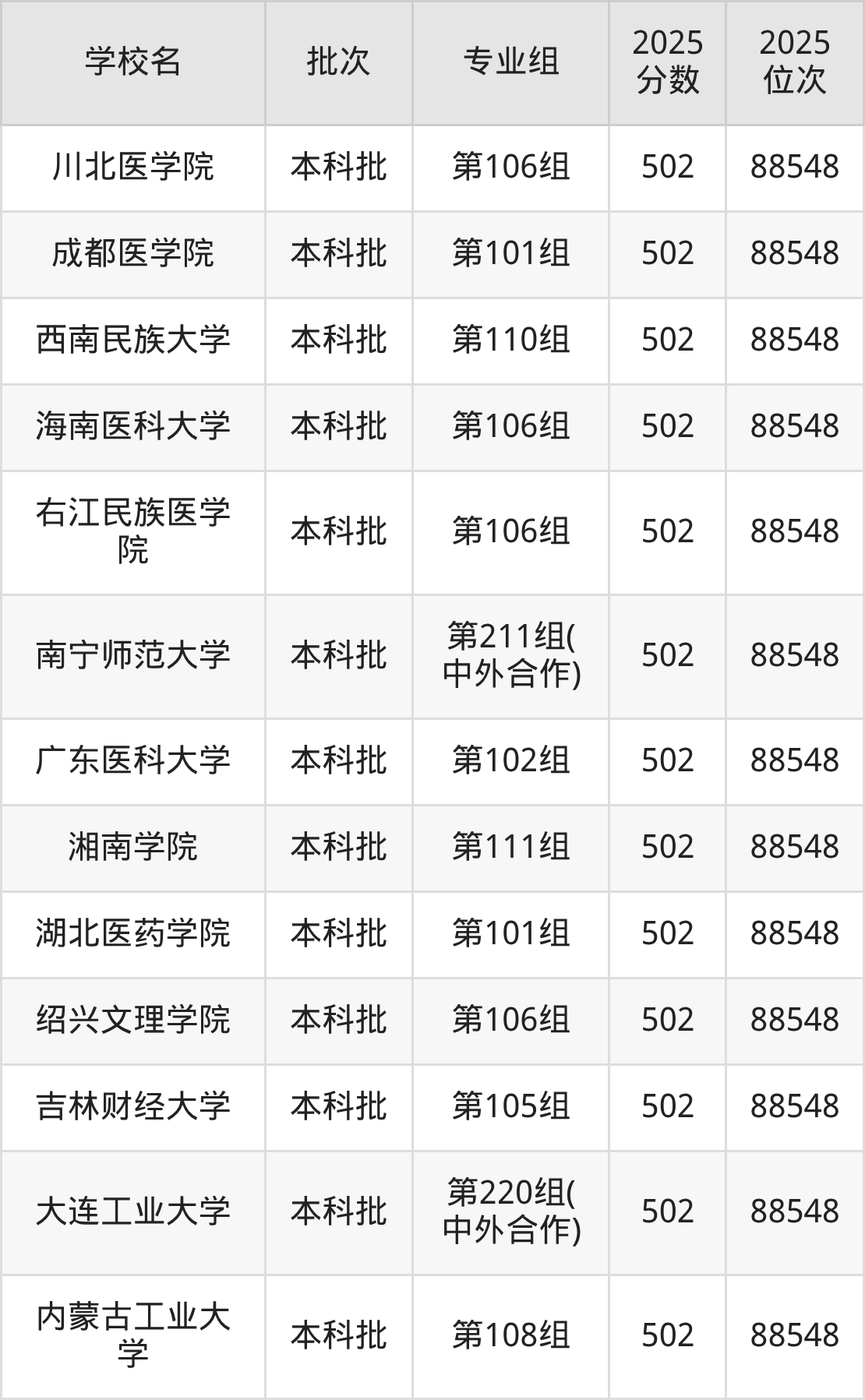 2025年湖南高考物理类502分(87521名~88548名)能上的大学有华北理工大学第106组、内蒙古工业大学第108组、大连工业大学第220组(中外合作)、吉林财经大学第105组等。