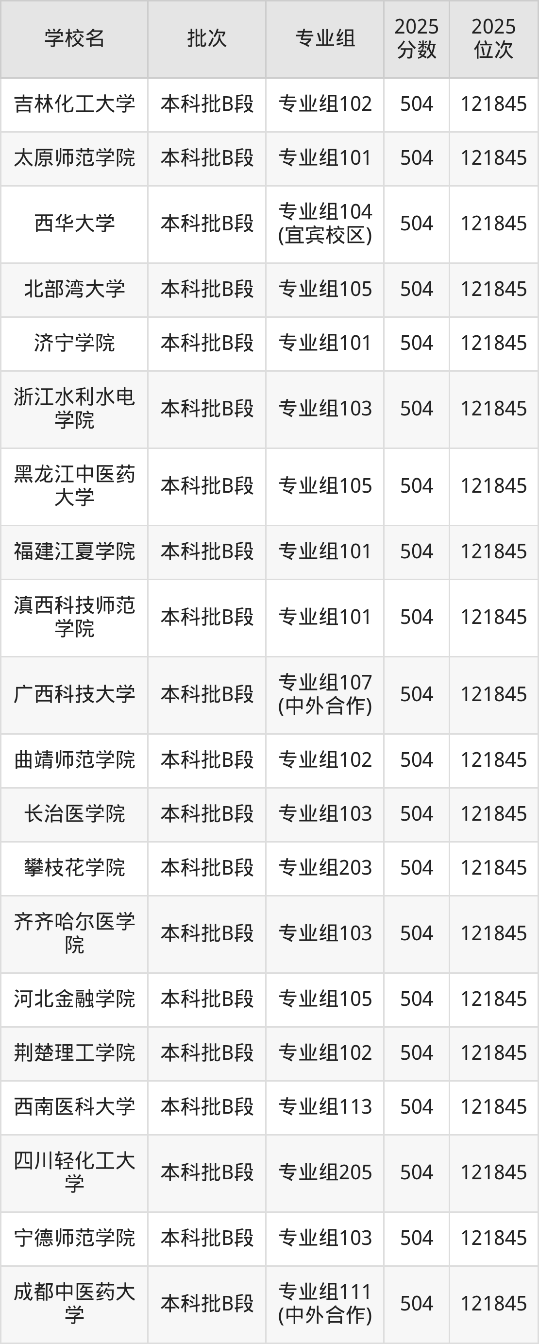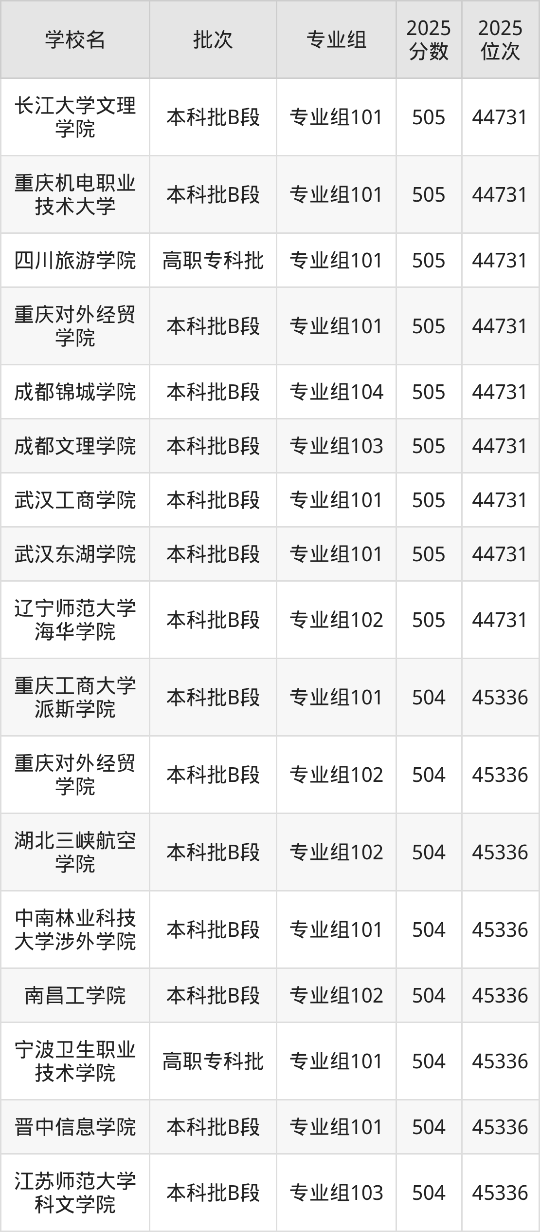 2025年四川高考历史类504分(44732名~45336名)能上的大学有宁波卫生职业技术学院专业组101、晋中信息学院专业组101、江苏师范大学科文学院专业组103、重庆工商大学派斯学院专业组101等。