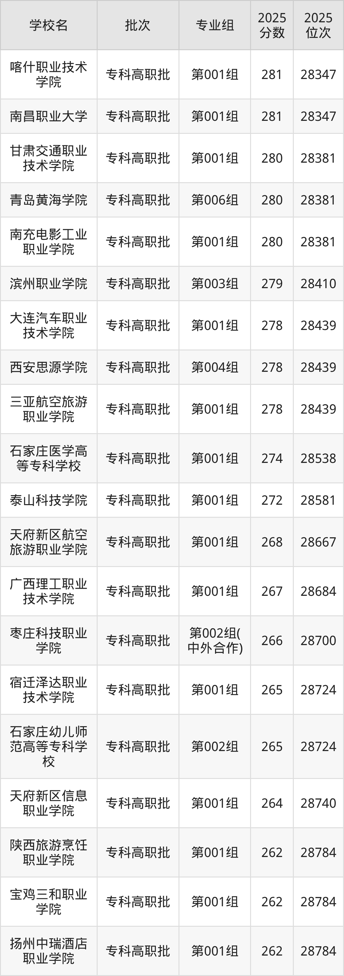 另外录取位次低于该区间(较稳妥)的有石家庄理工职业学院第001组(28891名)、四川城市职业学院第001组(28931名)等;录取位次高于该区间(可冲)的有陕西旅游烹饪职业学院第001组(28784名)、扬州中瑞酒店职业学院第001组(28784名)等。