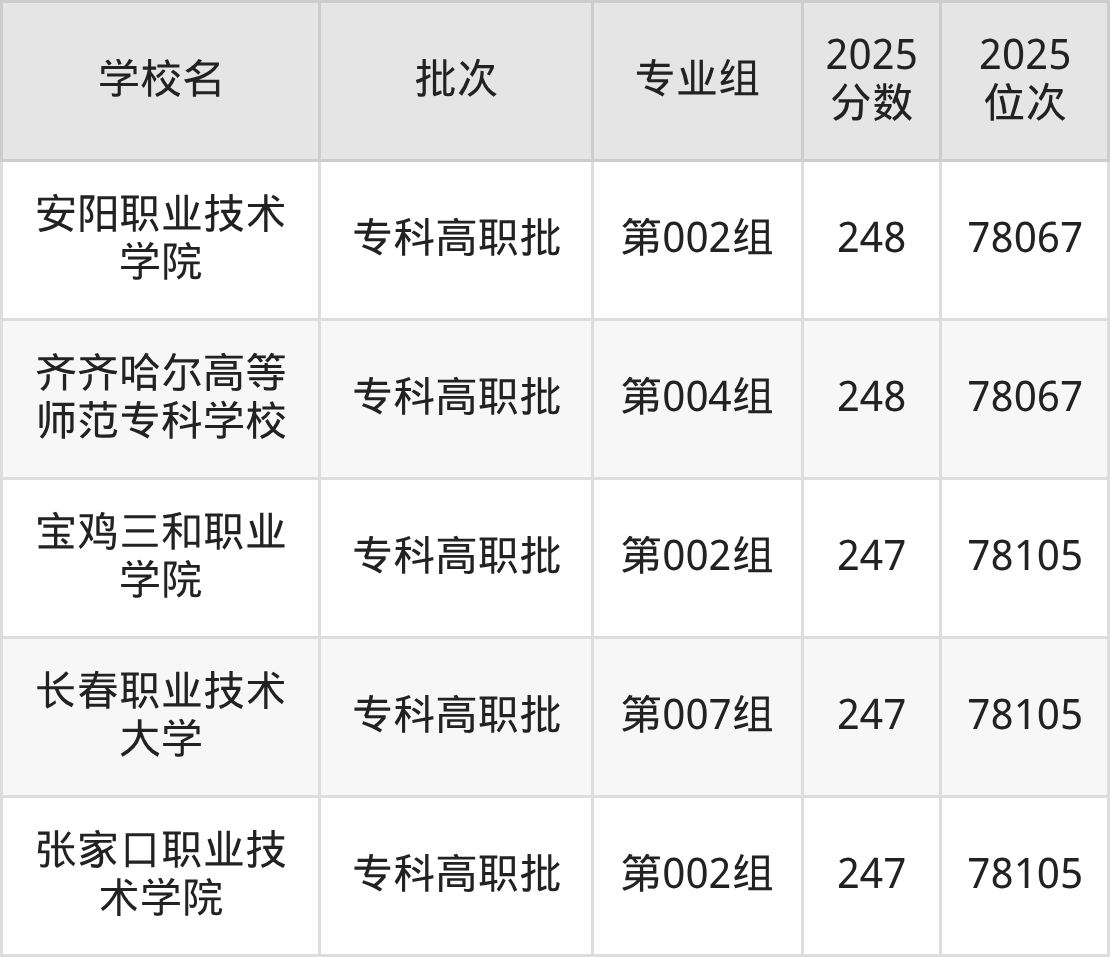另外录取位次低于该区间(较稳妥)的有黑龙江护理高等专科学校第002组(77685名)、哈尔滨传媒职业学院第006组(77685名)等;录取位次高于该区间(可冲)的有江西婺源茶业职业学院第002组(77596名)、陕西旅游烹饪职业学院第002组(77569名)等。