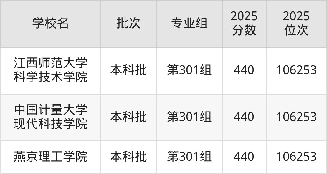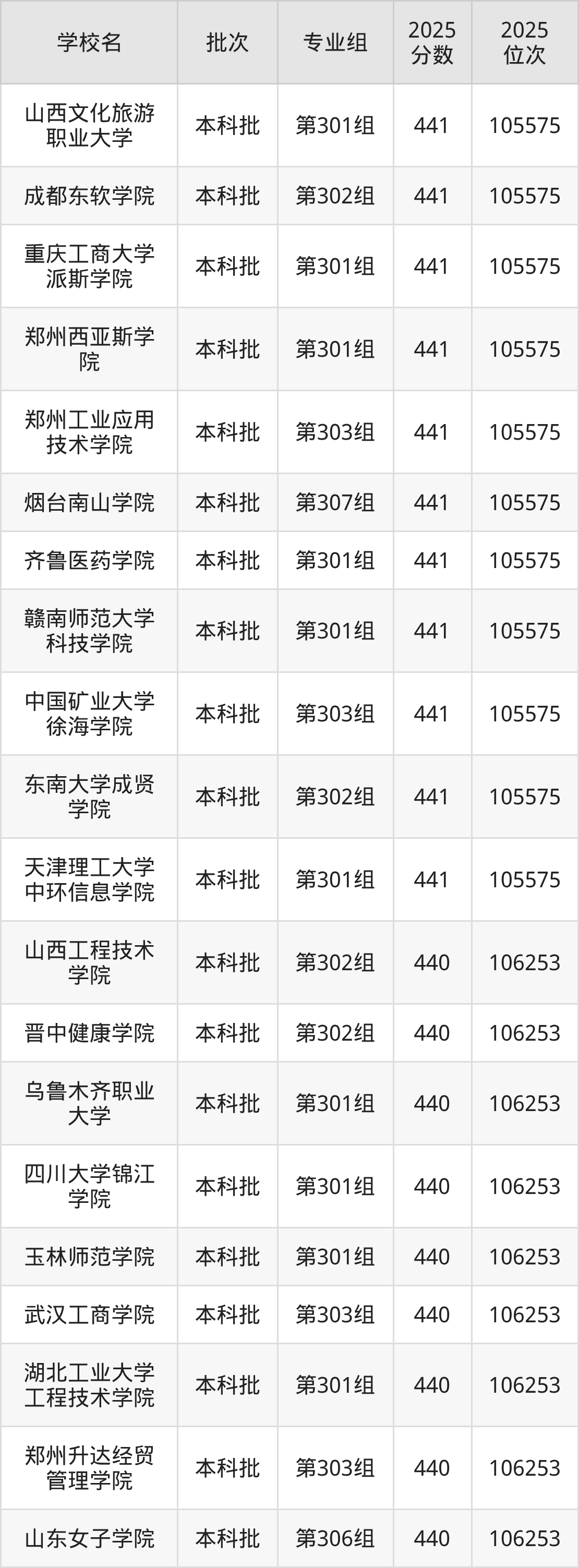 2025年山西高考物理类440分(105576名~106253名)能上的大学有燕京理工学院第301组、中国计量大学现代科技学院第301组、江西师范大学科学技术学院第301组、山东女子学院第306组等。
